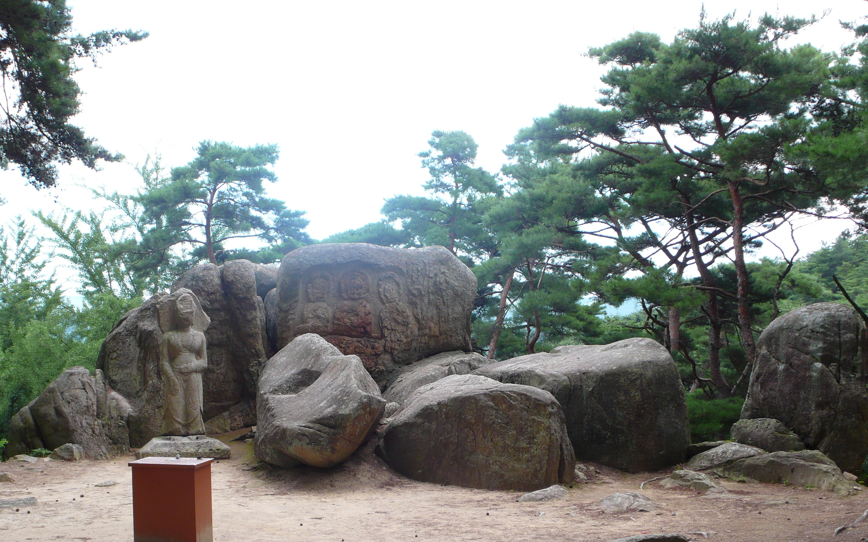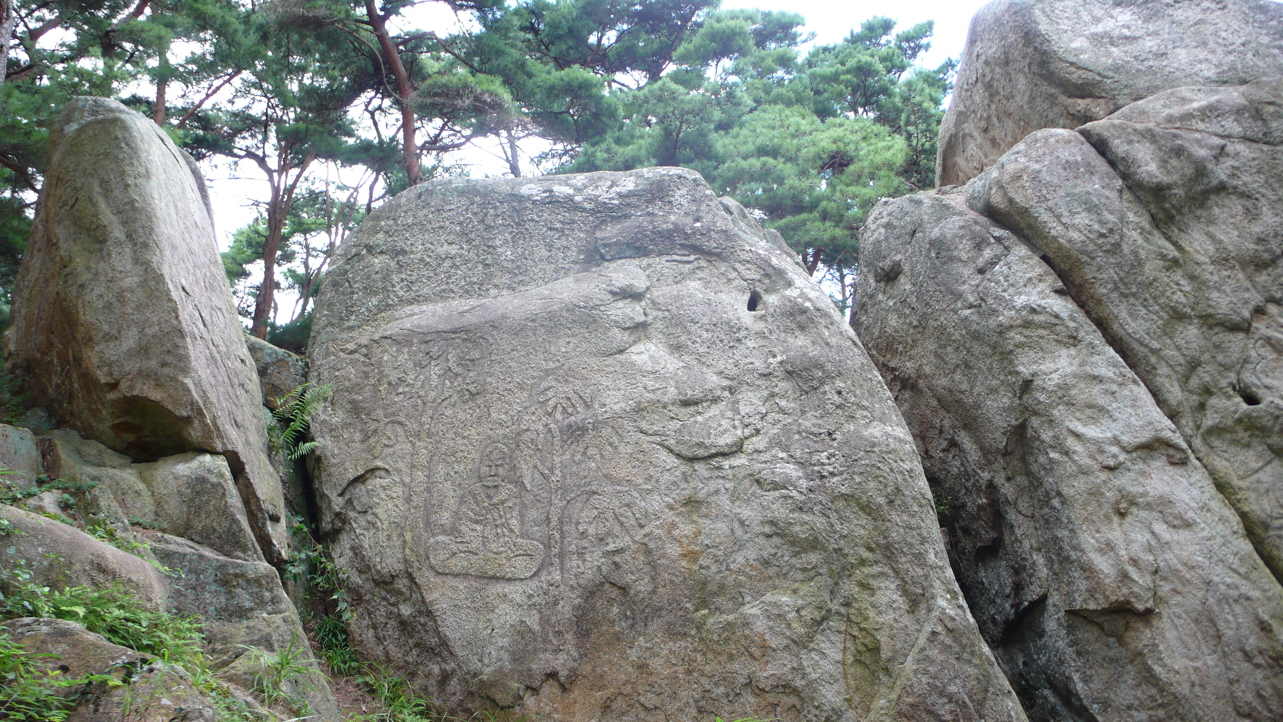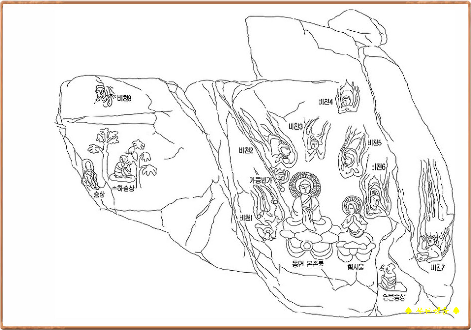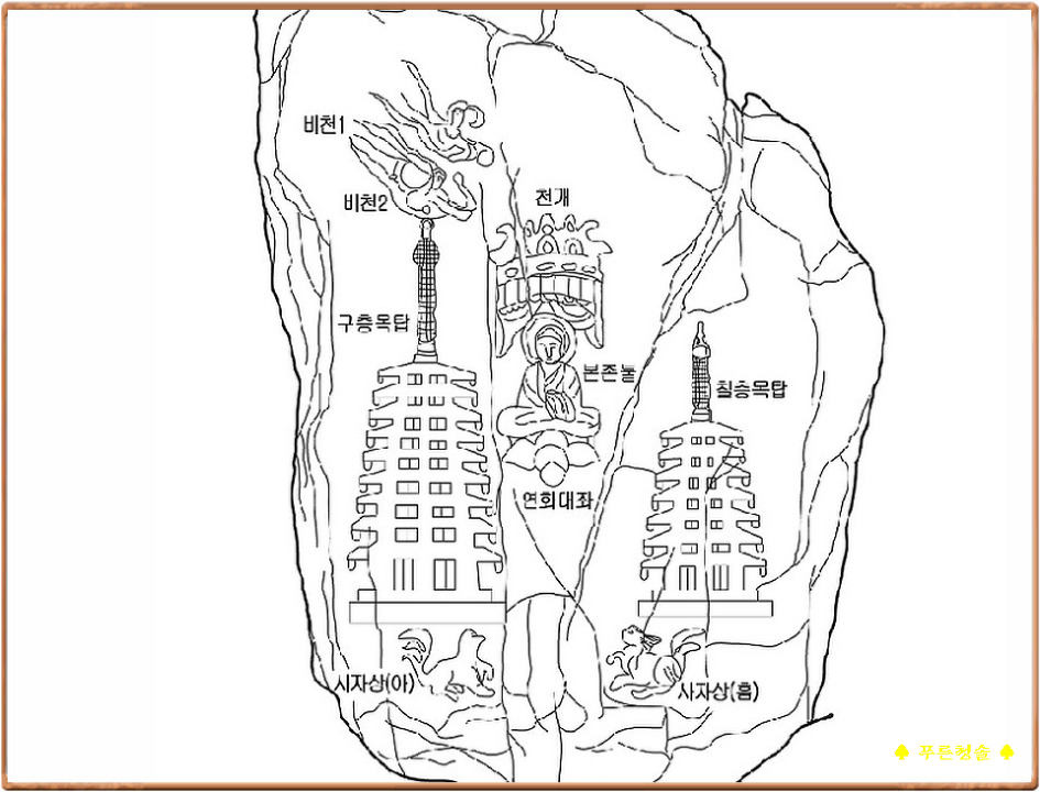 부처님 위로는 햇볕과 비바람을 막아주는 보개寶蓋(우산, 양산)가 펼쳐있다. 하늘에서는 천신이 내려와 부처님을 찬탄하고 땅에서는 주작과 현무를 배치시켜 부처님과 탑을 수호하고 있다. 천신과 부처님, 석탑과 수호신의 배치는 전형적인 사찰의 모습, 불국토의 모습을 바위에 재현해 놓은 모습이다.