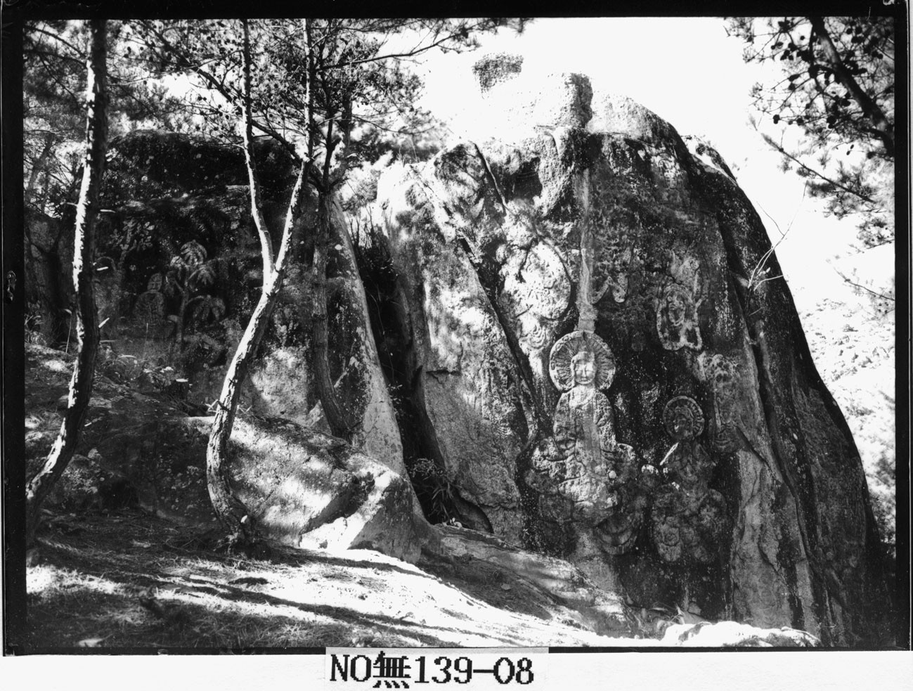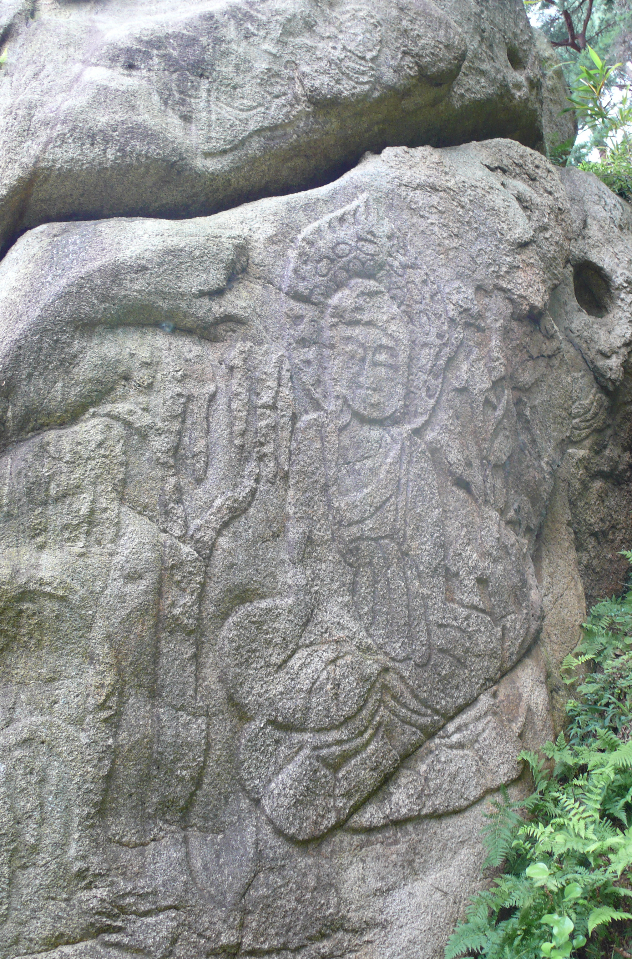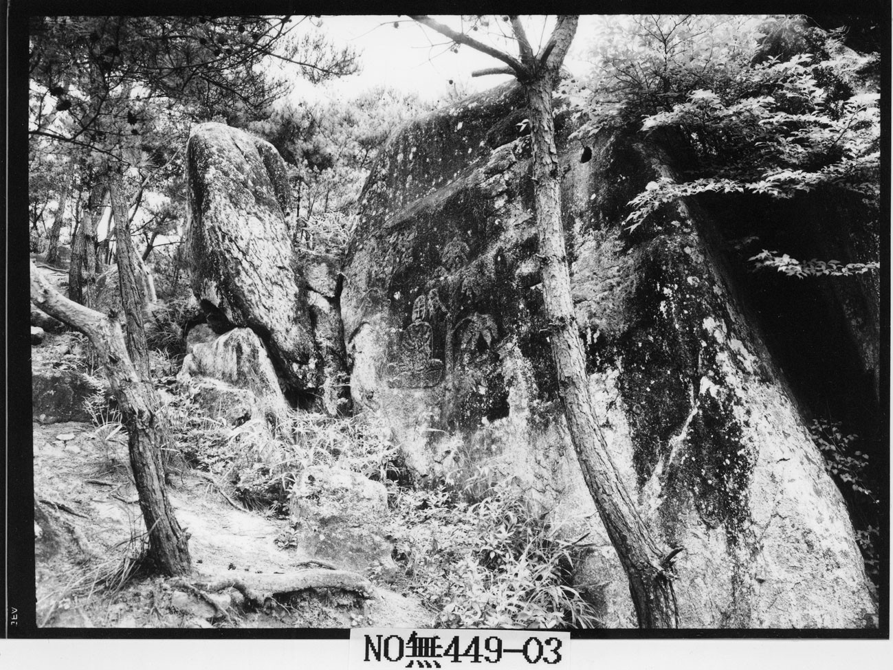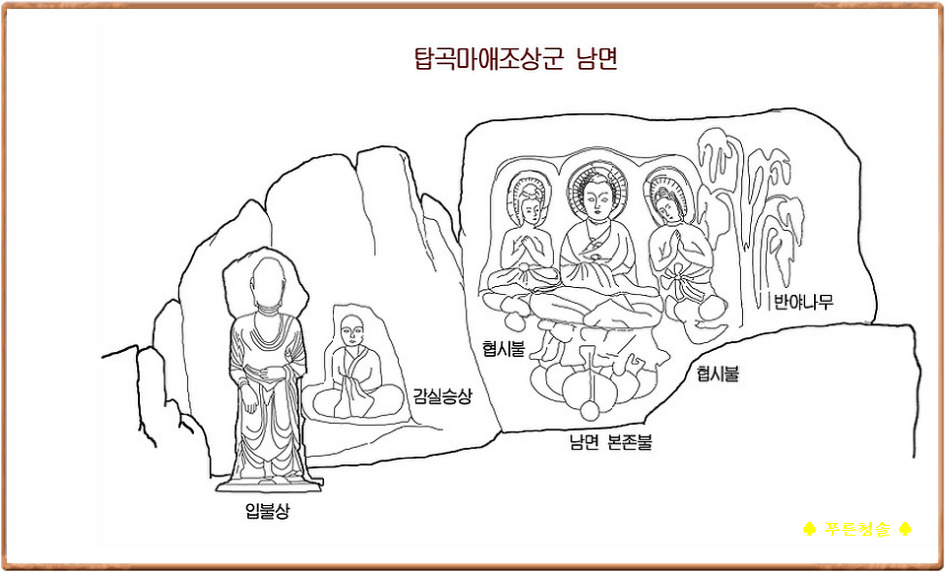 남쪽면에는 조그만 감실안에 삼존불을 부조형태로 새겼으며 그 옆에 보리수나무가 감실을 감싸고 있다. 입상 뒤로 감실에서 가부좌하고 있는 수행자와 앞쪽의 바위에 전법을 떠나는 듯한 또 하나의 승려상이 새겨있다. 그리고 항마촉지인을 하고있는 석불입상과 삼층석탑이 위치해 있다.