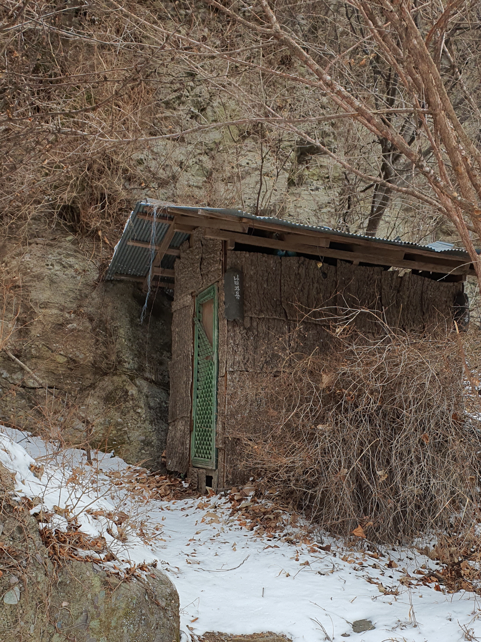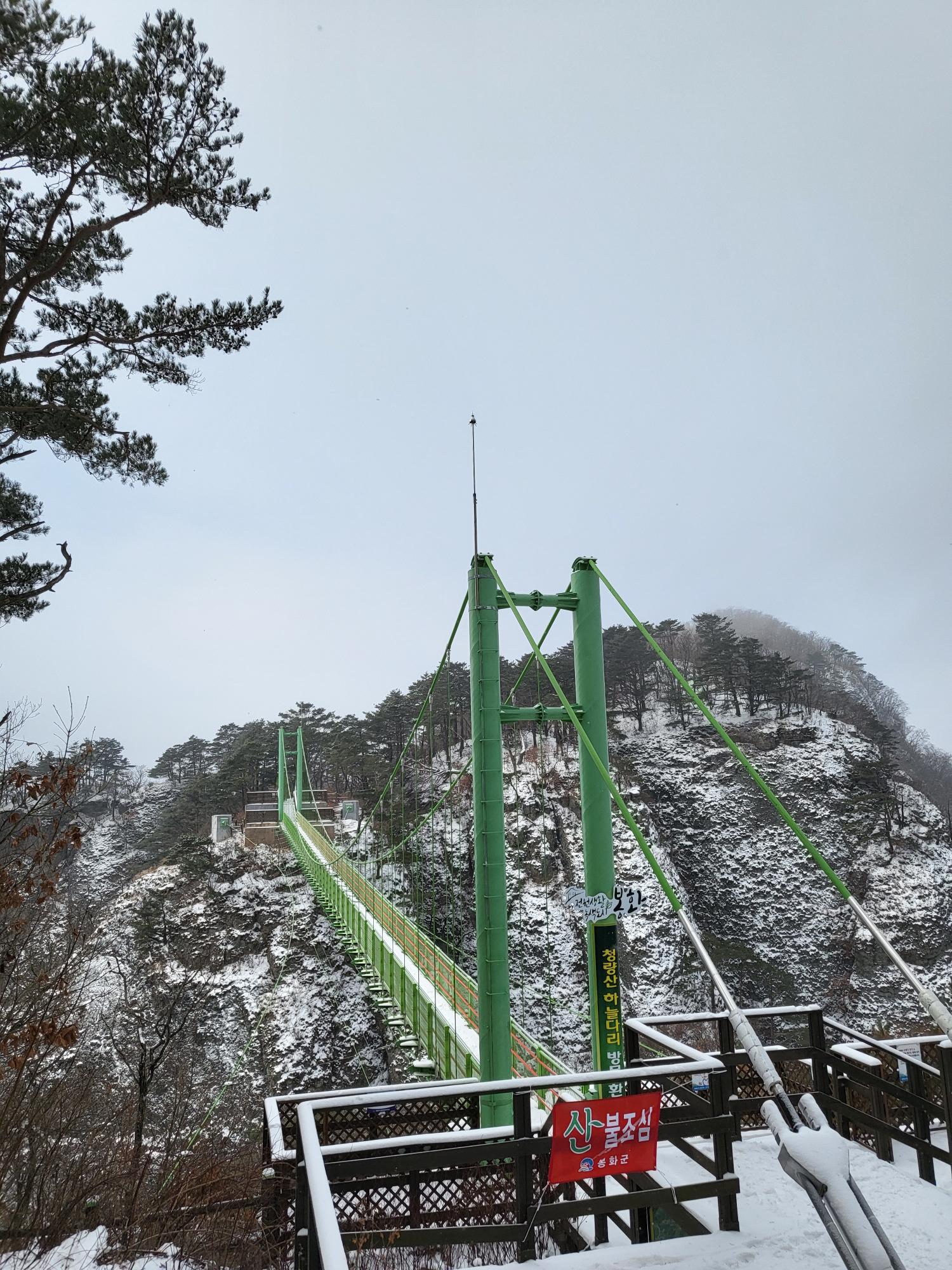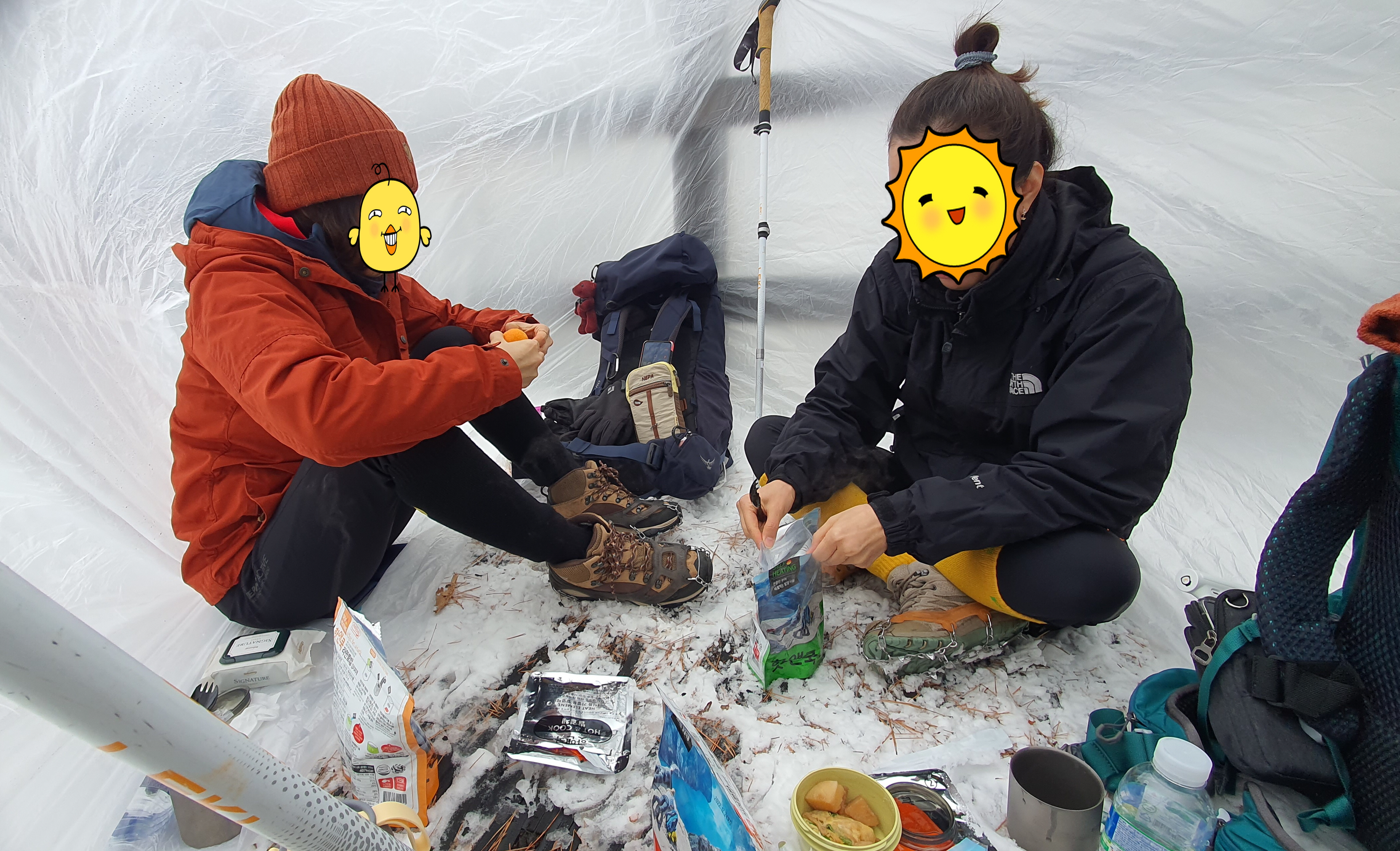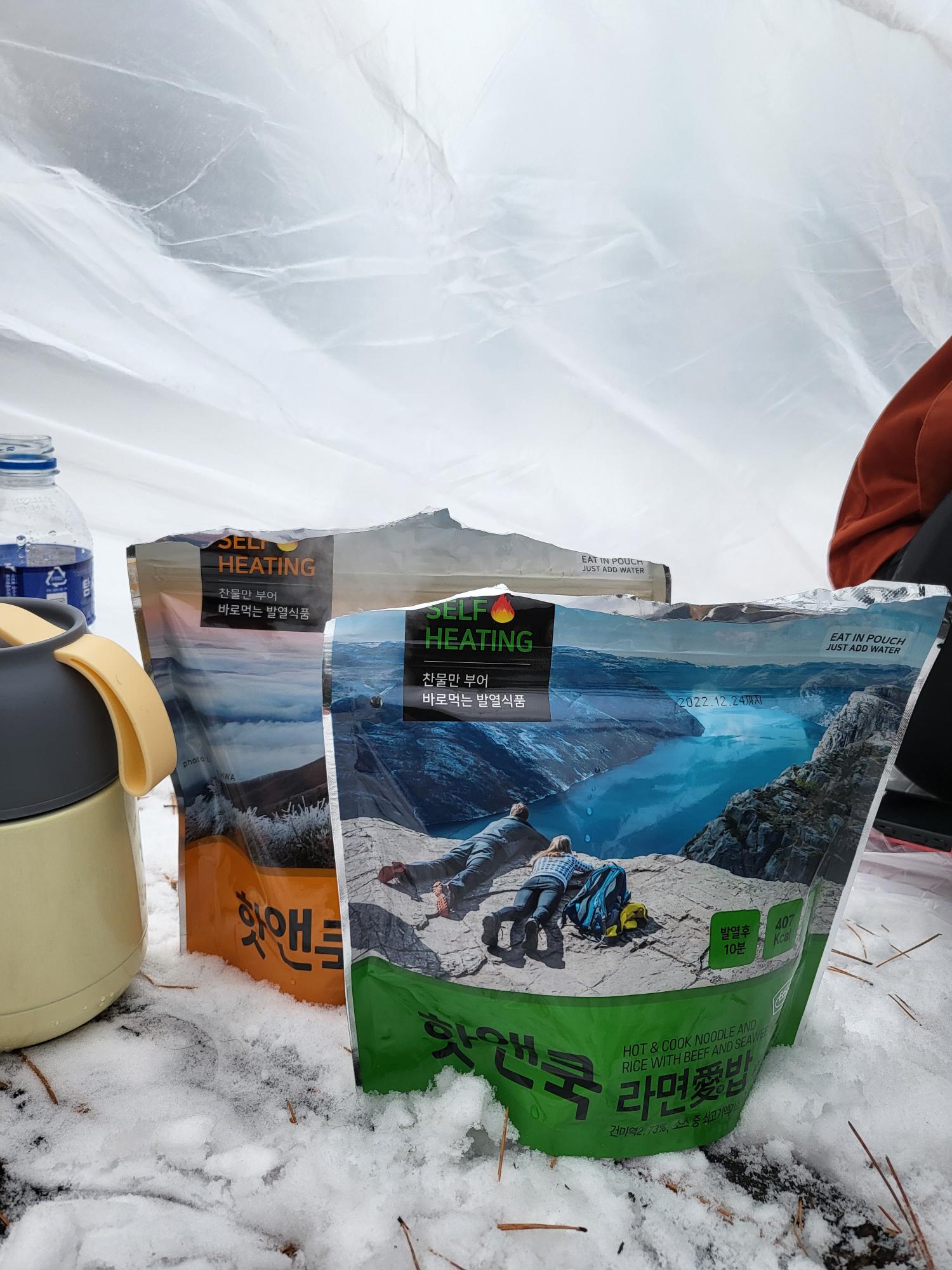 하늘다리 앞에서 점심을 먹기로 하고 눈을 치우는데.... 그런데 바람과 눈이 계속 오기에 춥고 몸이 떨린다...이때 산우가 웃으면서 배낭에서 쉘터를 꺼낸다. 이게 뭔가하고 봤더니 비닐천막. 눈막고 바람막고...하우스 안에서 따뜻한 점심식사를 했다. 쉘터...티브이에서 간간이 봤으나 저걸 사용할정도면 산에가지말아야지 했는데...이제보니 필수품이네. 눈, 비, 바람막고 안에는 온기가 훈훈. 고어텍스보다 낳네. 그나저나 깜짝쇼로 쉘터 가지고 왔는데 눈 안왔으면 어쩔번 했누.
