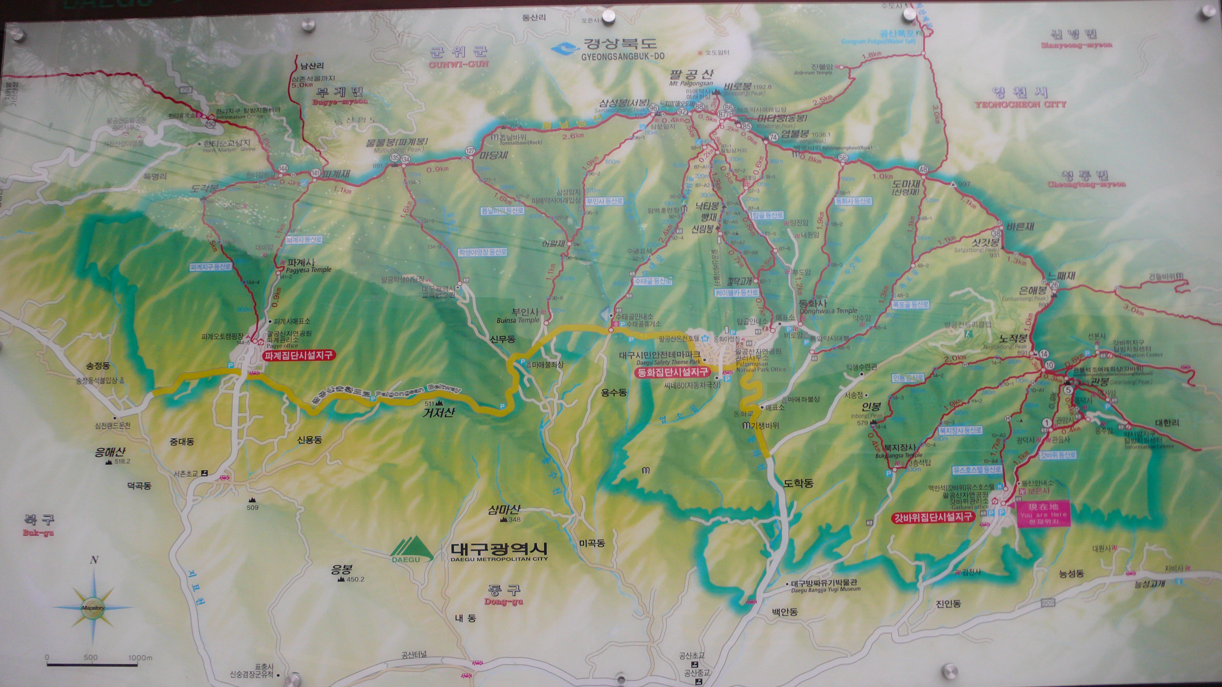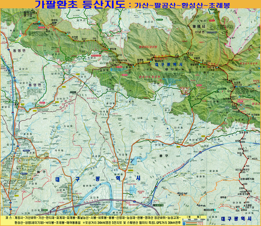 ◆ 산행코스 : 한티재 - 삼갈래봉(834m) - 파계봉(991m) - 가마바위봉(1054m) - 서봉(1150m) - 비로봉(1193m) - 동봉(1167m) - 염불봉(1036m) - 신령봉(997m) - 삿갓봉(931m) - 은해봉(882m) - 노적봉(887m - 관봉(갓바위 852m) - 갓바위지구
