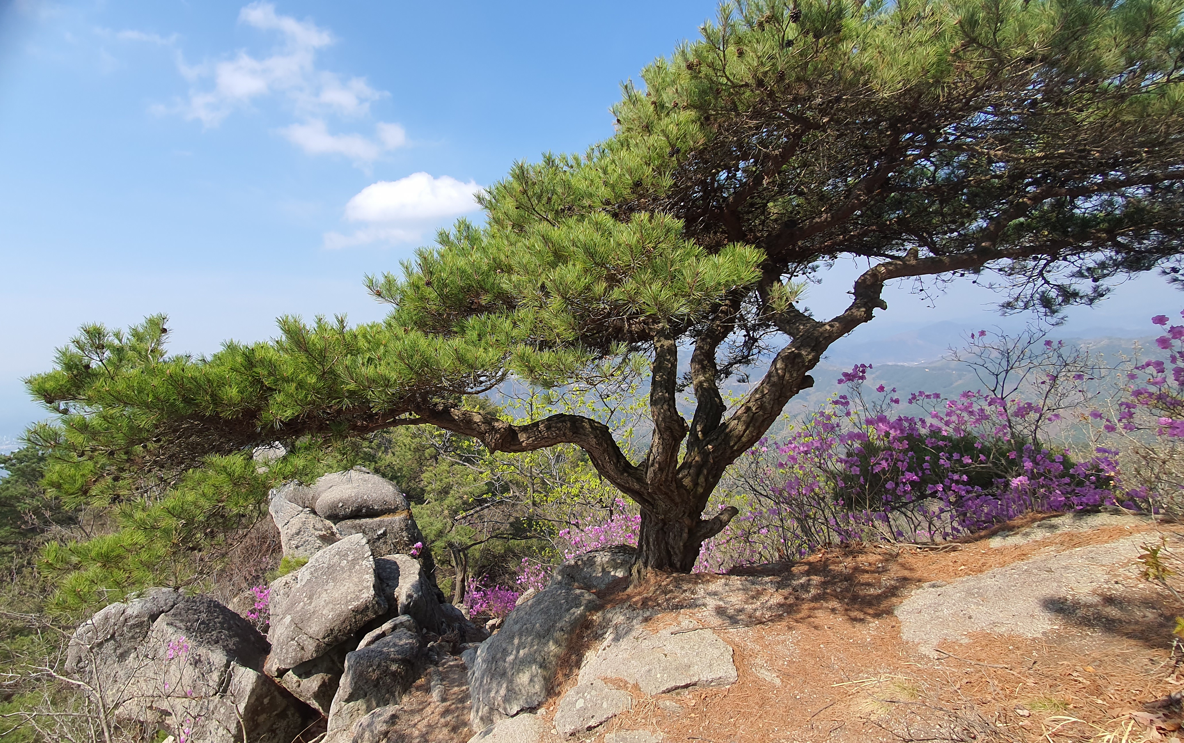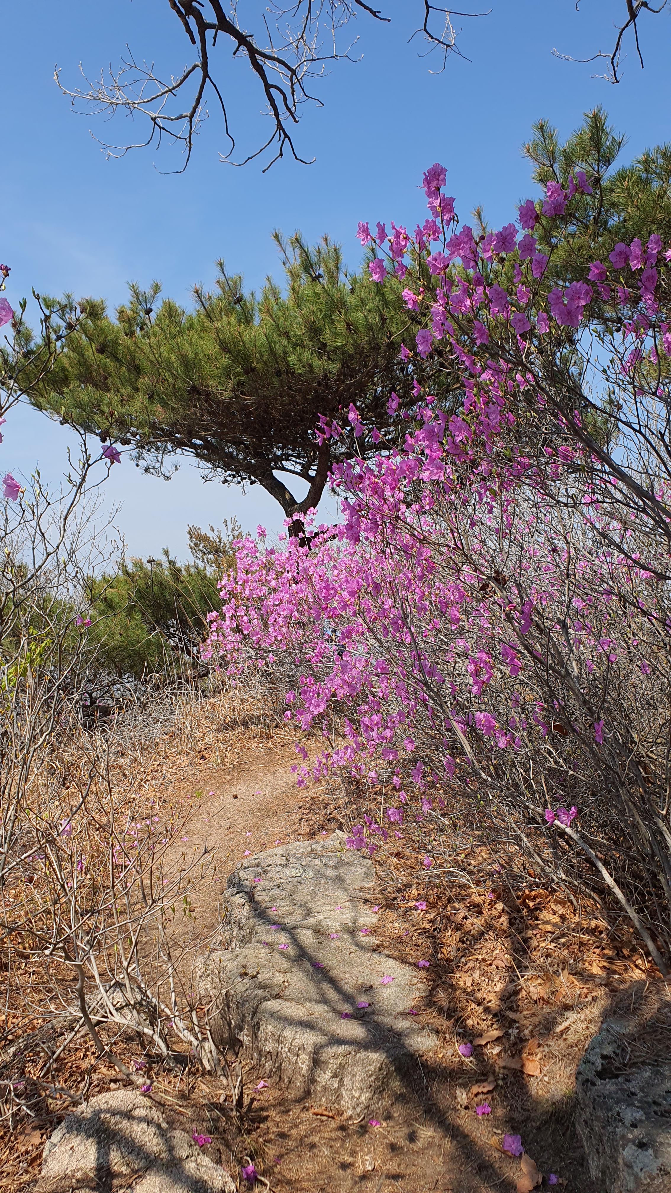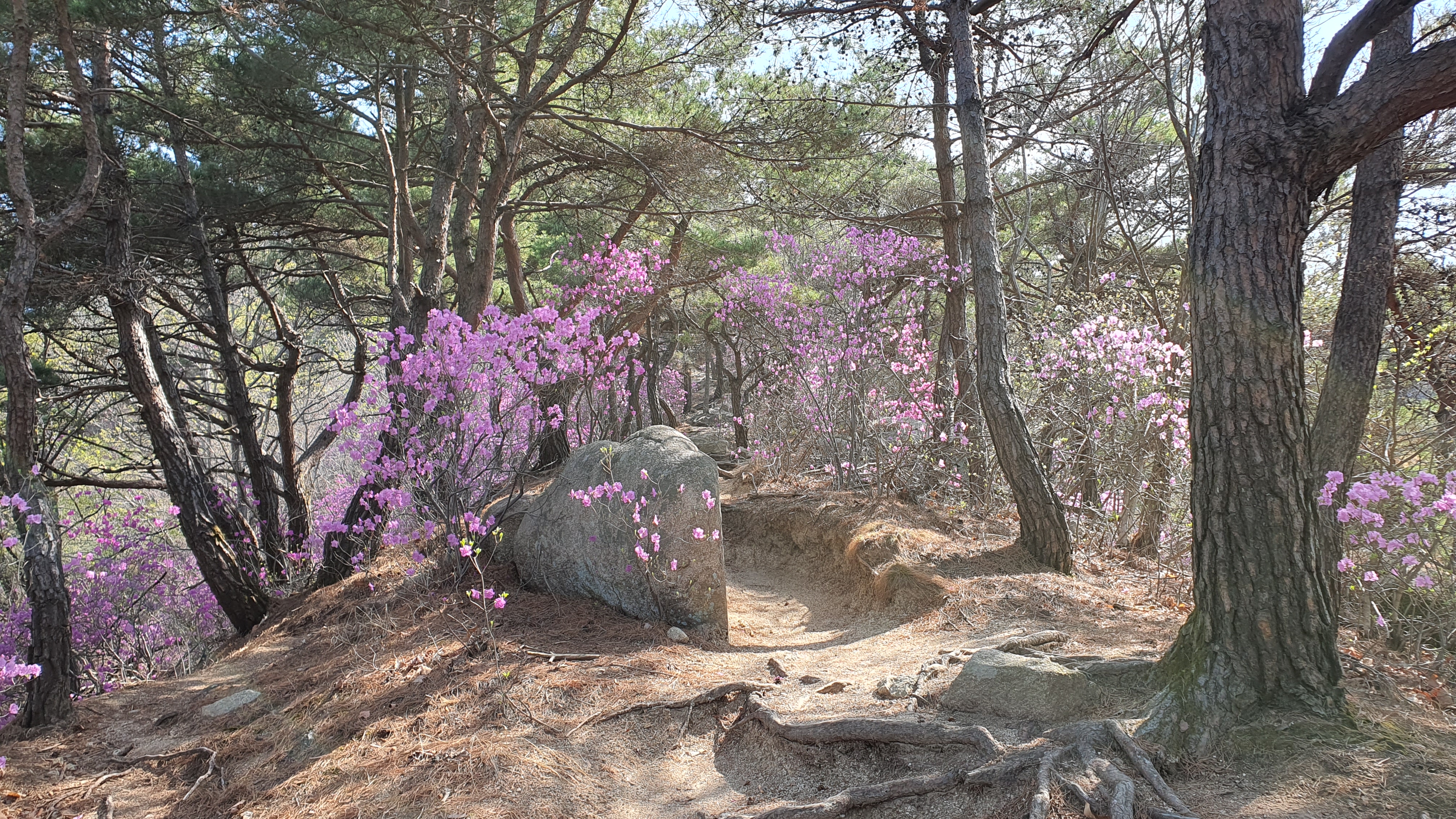 진달래 - 달래는 달래인데 왜 앞에 진자가 붙었을까? 진달래. 봄이면 어김없이 피어나며 절대 산을 떠나지 않습니다. 바위와 아름드리 소나무와 함께 당당히 산의 주인으로 살아가는 진달래. 그래서 진자가 붙었나?