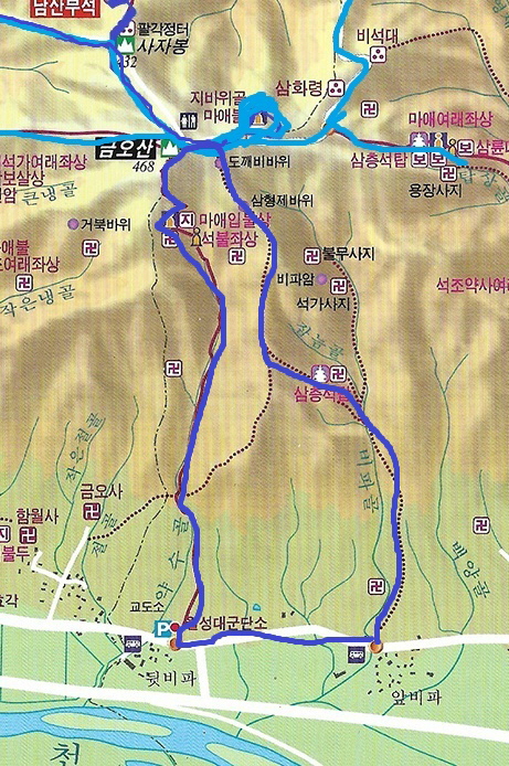 용장4리 마을회관 주차 - 비파골 3층석탑 - 3형제바위 - 도깨비 바위 - 금오봉 - 약수곡 마애불 - 약수곡 4사지 - 용장4리 마을회관 4.8키로. 3시간