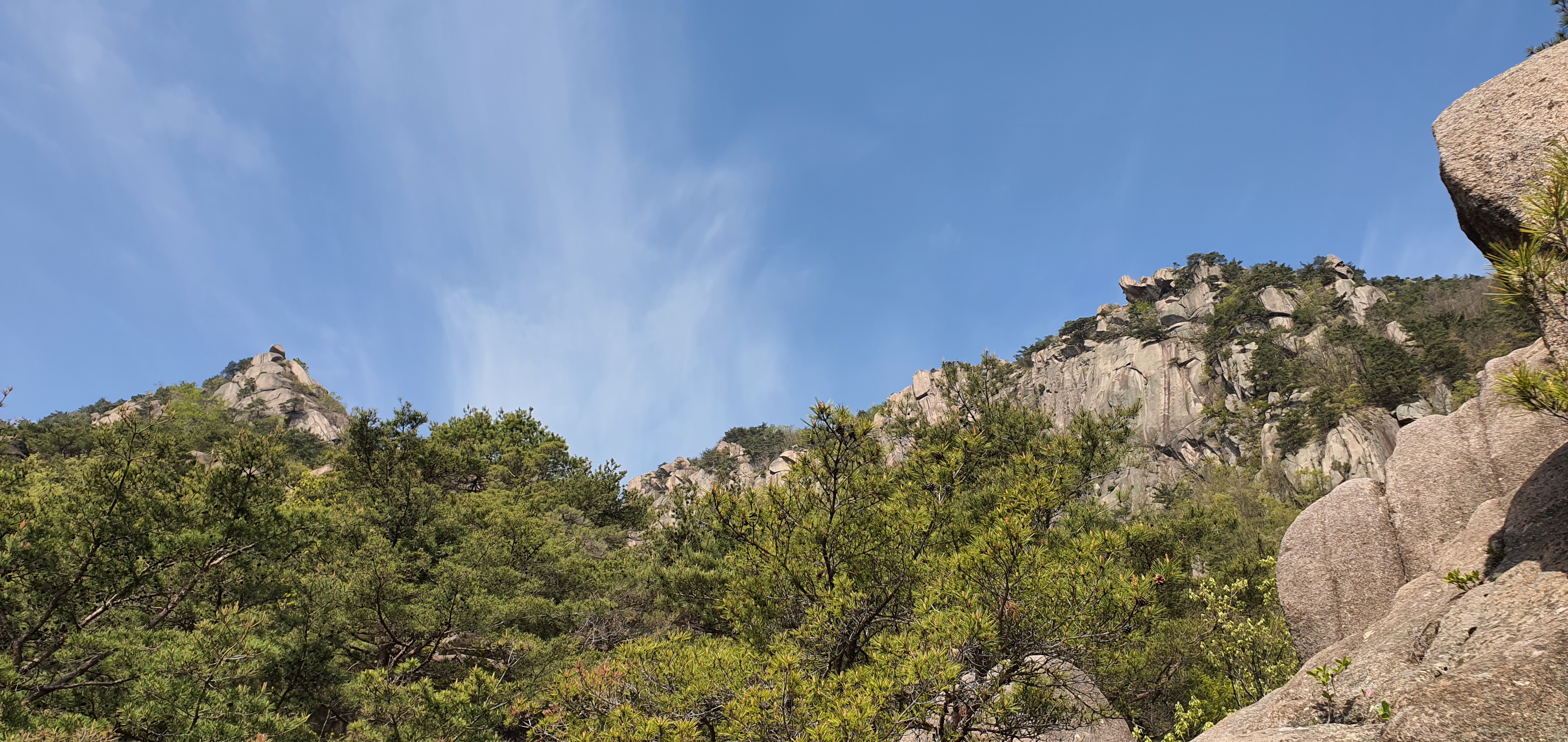하산코스에서 바라본 맞은편 돛대바위. 물푸레나무가 아름답게 바쳐주고...