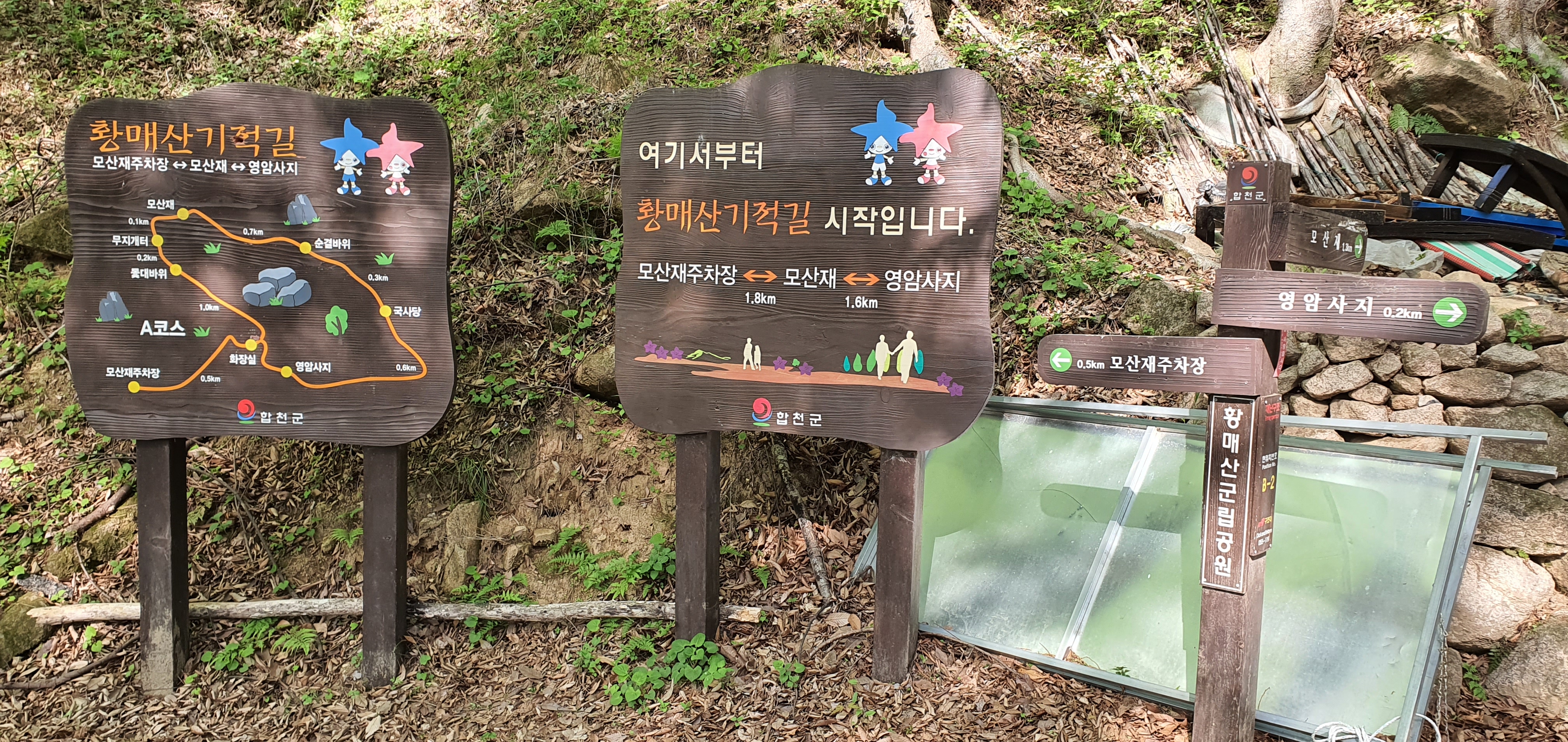 영암사(모산재주차장) 주차장(조사전자리) - 돛대바위 - 모산재 - 황매산철쭉군락지- 황매산 정상 - 모산재 - 순결바위 - 영암사(본당자리)
