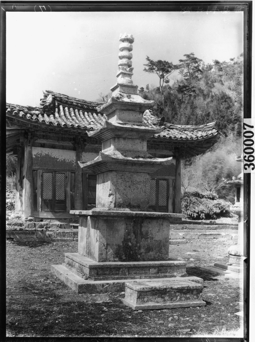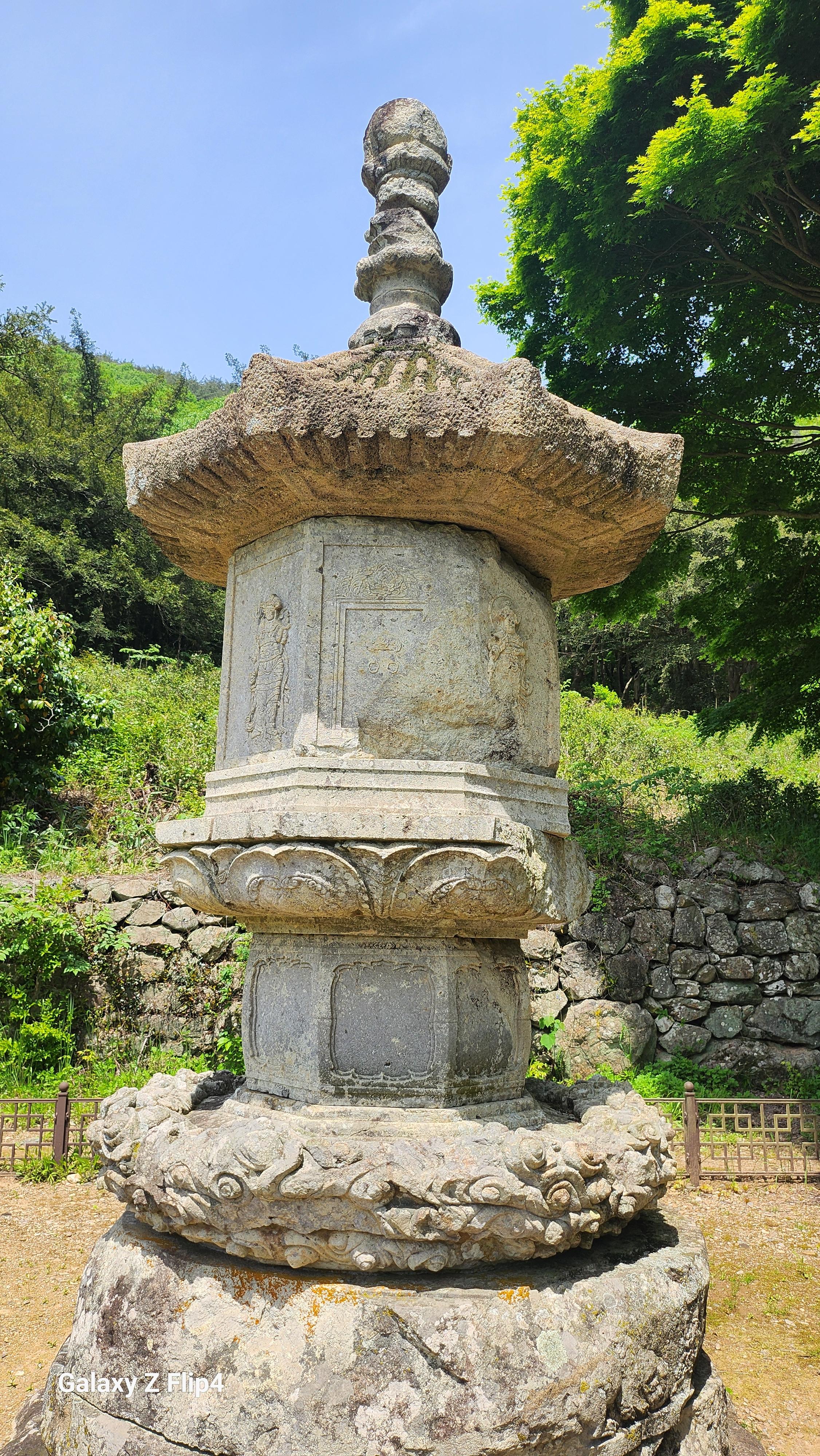 8개의 큰 연꽃조각 위에 놓여진 탑신의 몸돌은 앞· 뒷면에 출입문을, 그 양 옆에는 사천왕상四天王像을 새겼다. 두터워 보이는 지붕돌은 밑면에 서까래, 윗면에는 기왓골이 깊게 파여져 있다. 꼭대기에는 복발(覆鉢:엎어놓은 그릇모양의 장식), 보륜(寶輪:바퀴모양의 장식), 보주(寶珠:연꽃봉오리모양의 장식) 등이 차례로 놓여 있다.(안내)