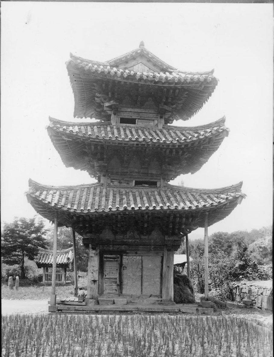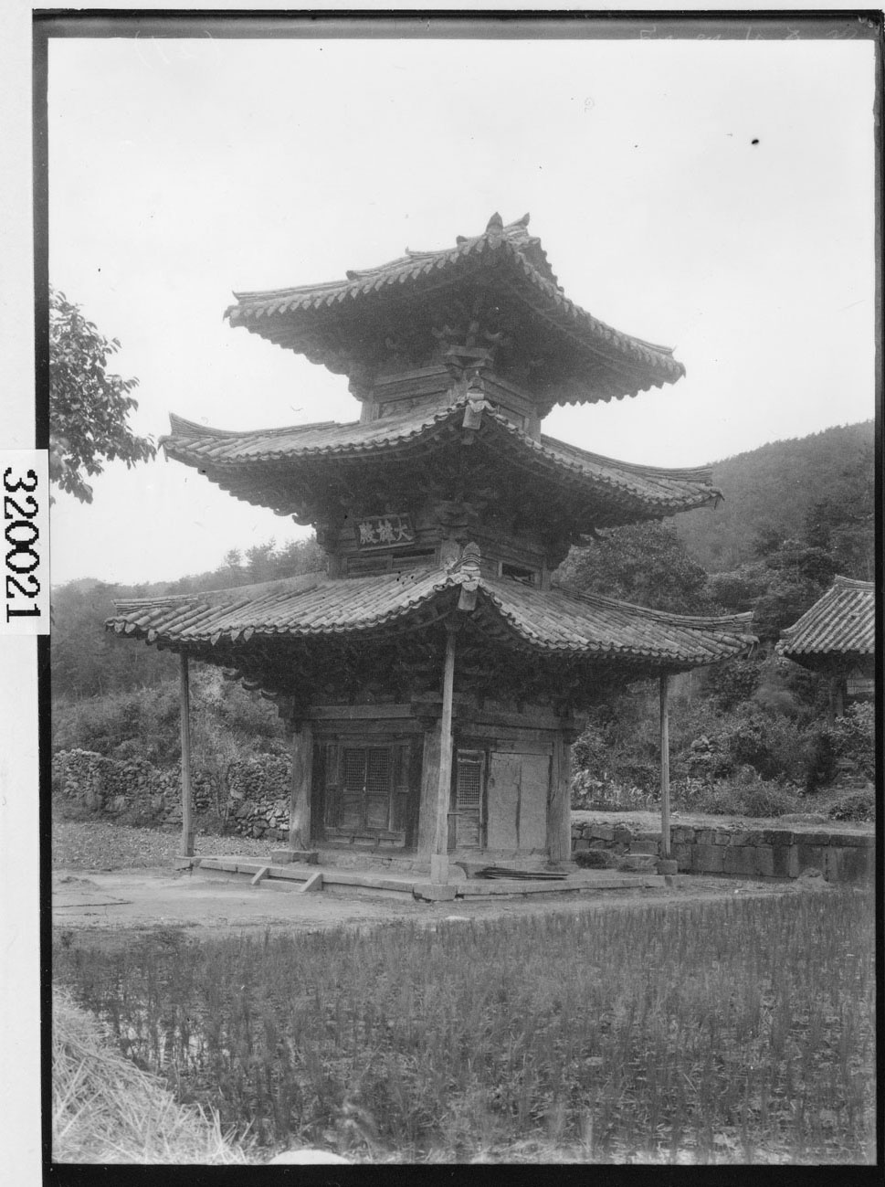 1962년 해체 수리 때 발견한 설계대로 화재로 소실된 3층 목탑 대웅전을 3층 지붕을 팔작지붕에서 사모지붕(사각지붕)으로 바꾸고 상륜부를 올려서 세웠다...아래 일제강점기때 찍은 흙백사진을 보면 지붕이 바뀌었음을 알수있다.