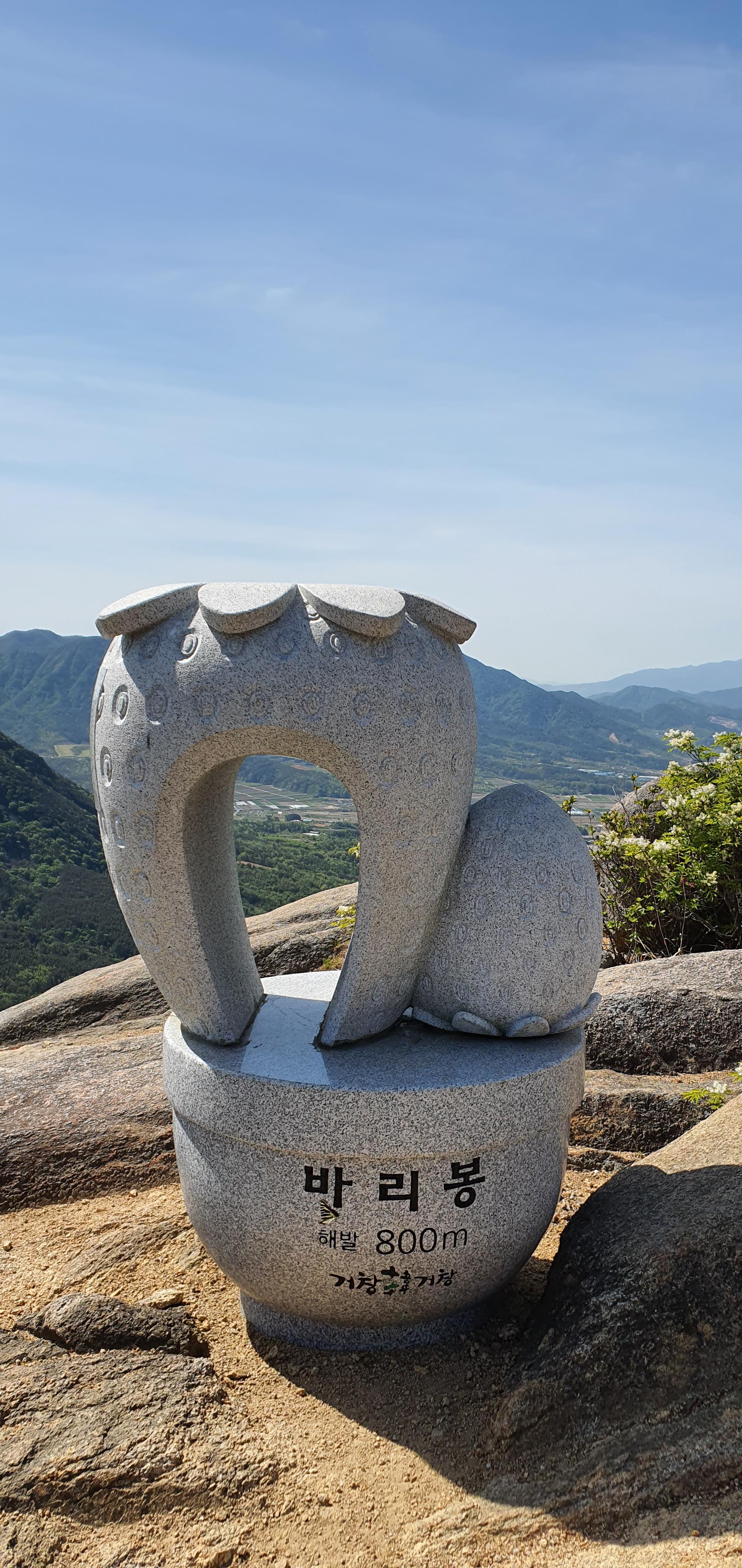 바리봉 정상 조형물...베낭에 바리바리 싸들고 바래봉에 오르니 정상석이 반겨준다.