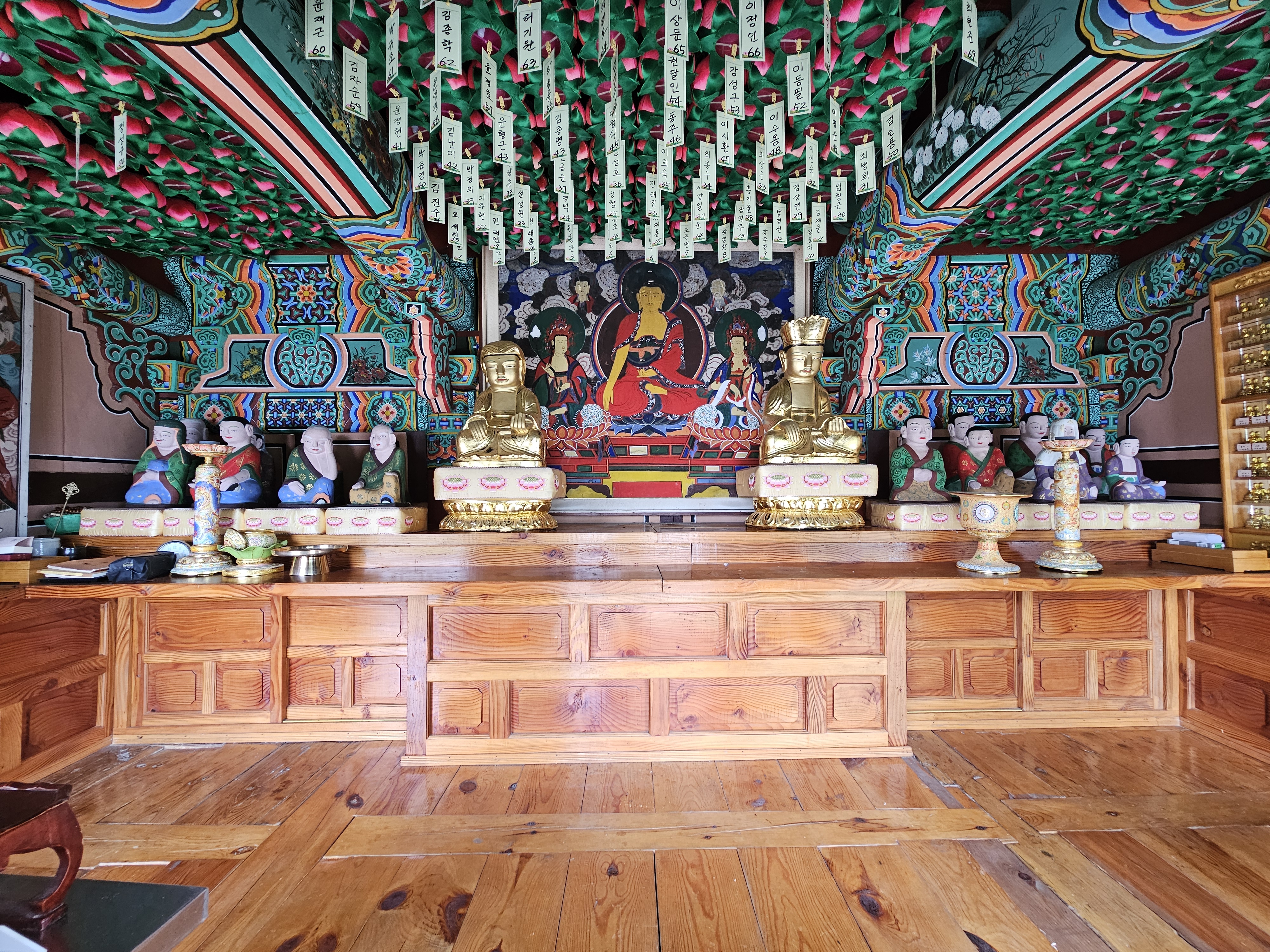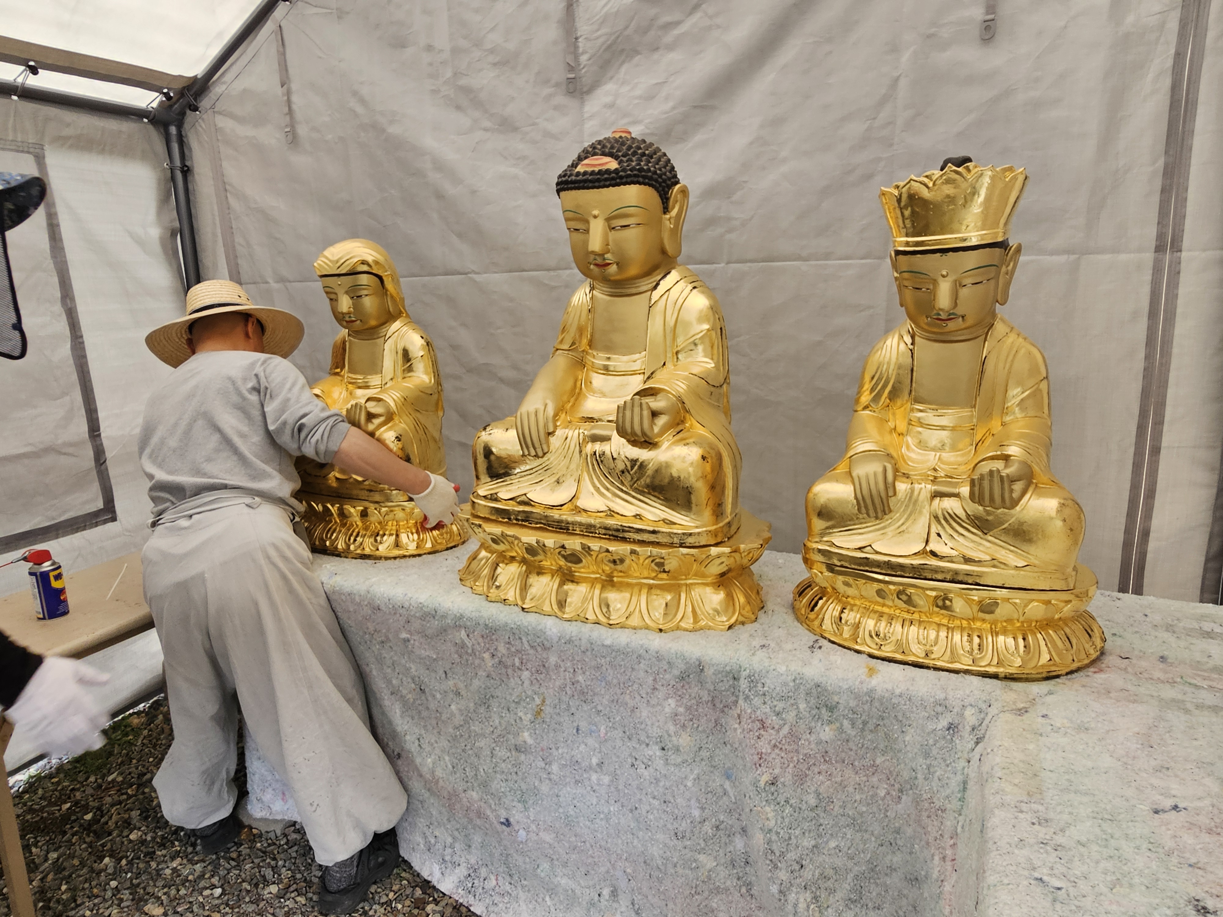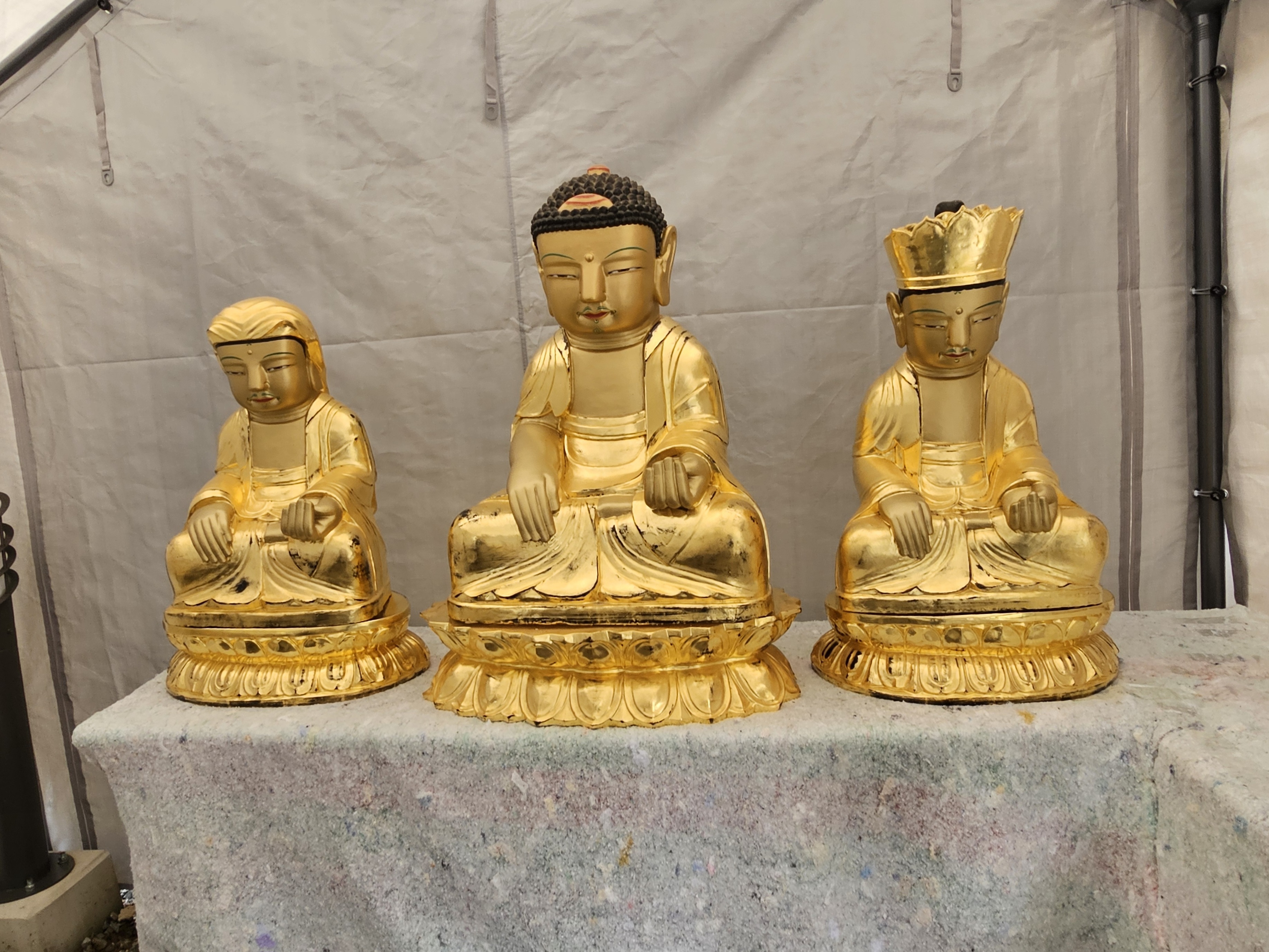 영산전 보수를 위해 삼존불을 이동중이시다. 영산전 석불로 석가모니, 미륵보살, 제화갈라보살이라는데... 상호가 매우 근엄하시다. 경주국립박물관에 있는 삼화령 미륵삼존불과 너무 닮은꼴이다.