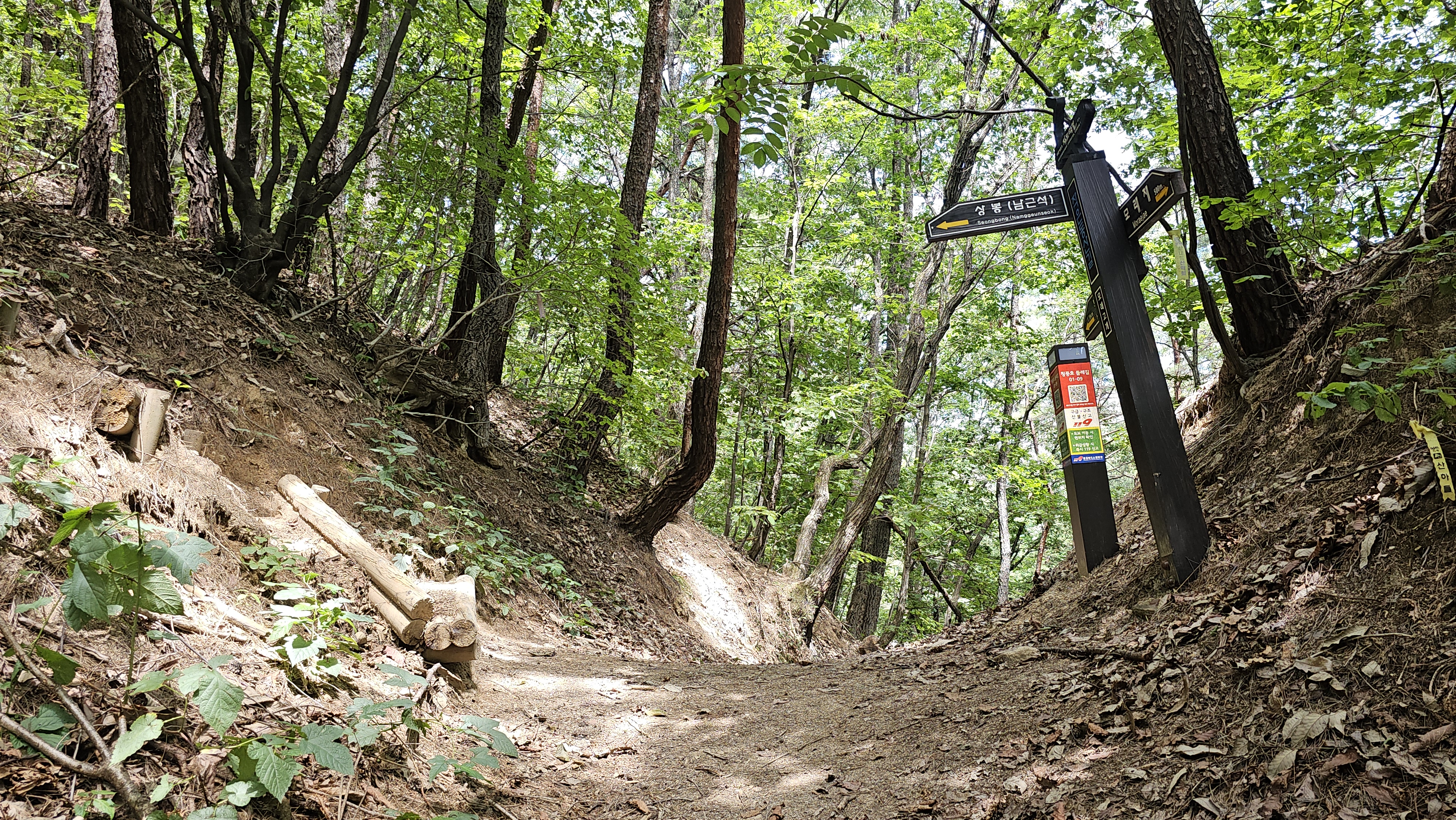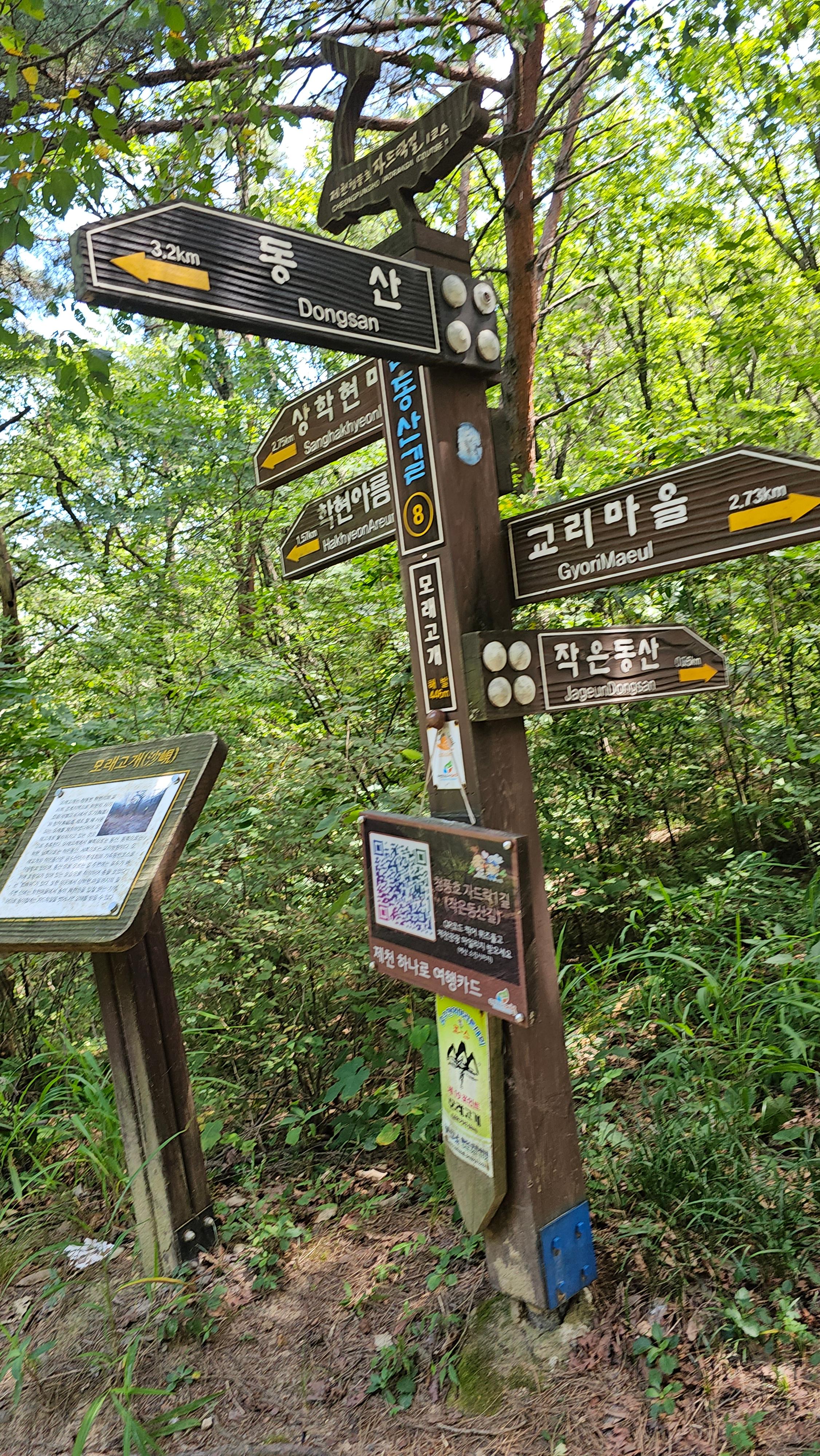 여기서 알바...내려가다 작은동산 팻말보고 가야되는데...방향을 보고 가다 교리마을방향으로 내려와버렸네...다시 목장 지붕이 보이는 포장길. 방향만 보고 오솔길을 따라 치고 올라가니...목장삼거리 간신히 합류,