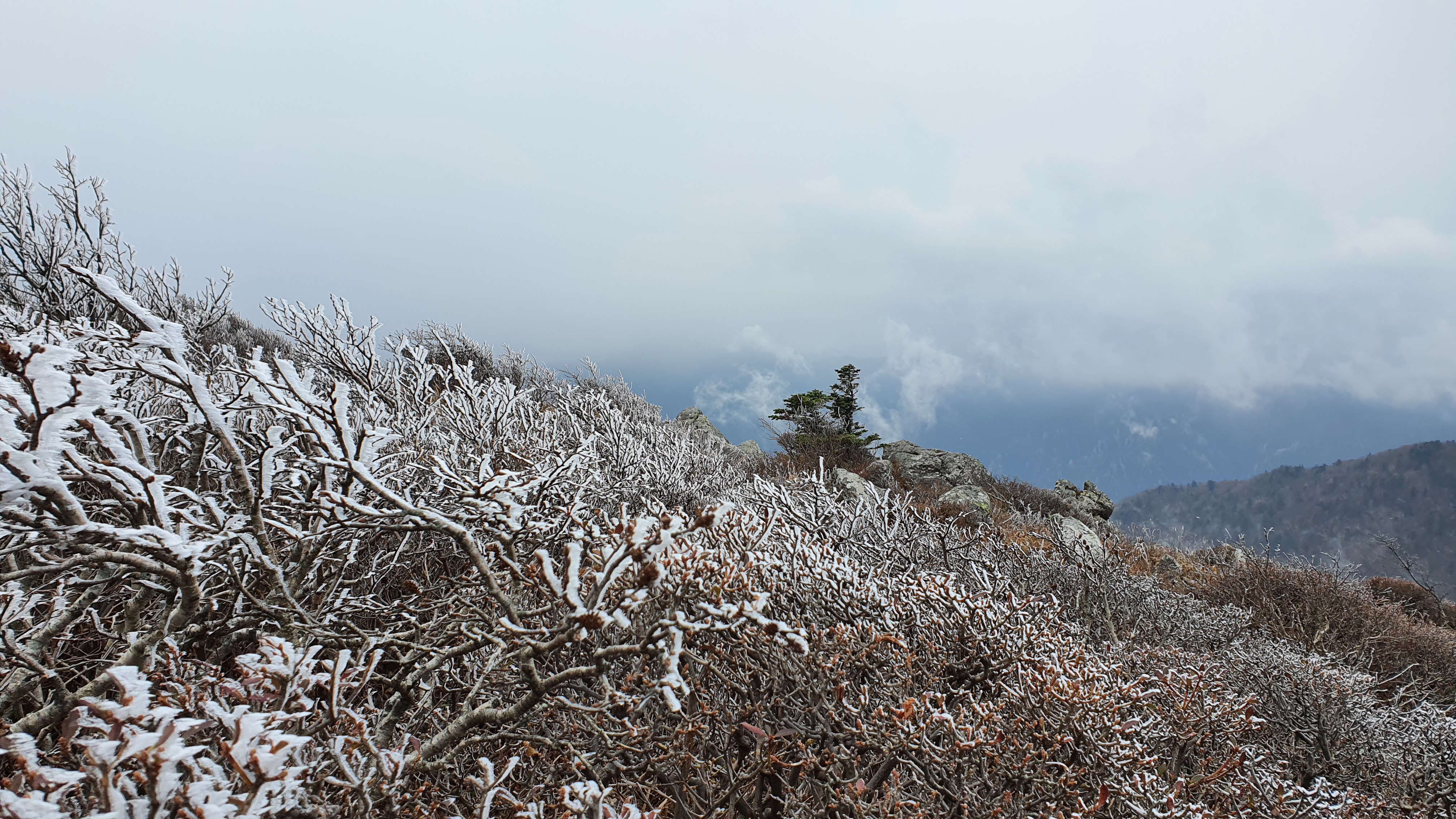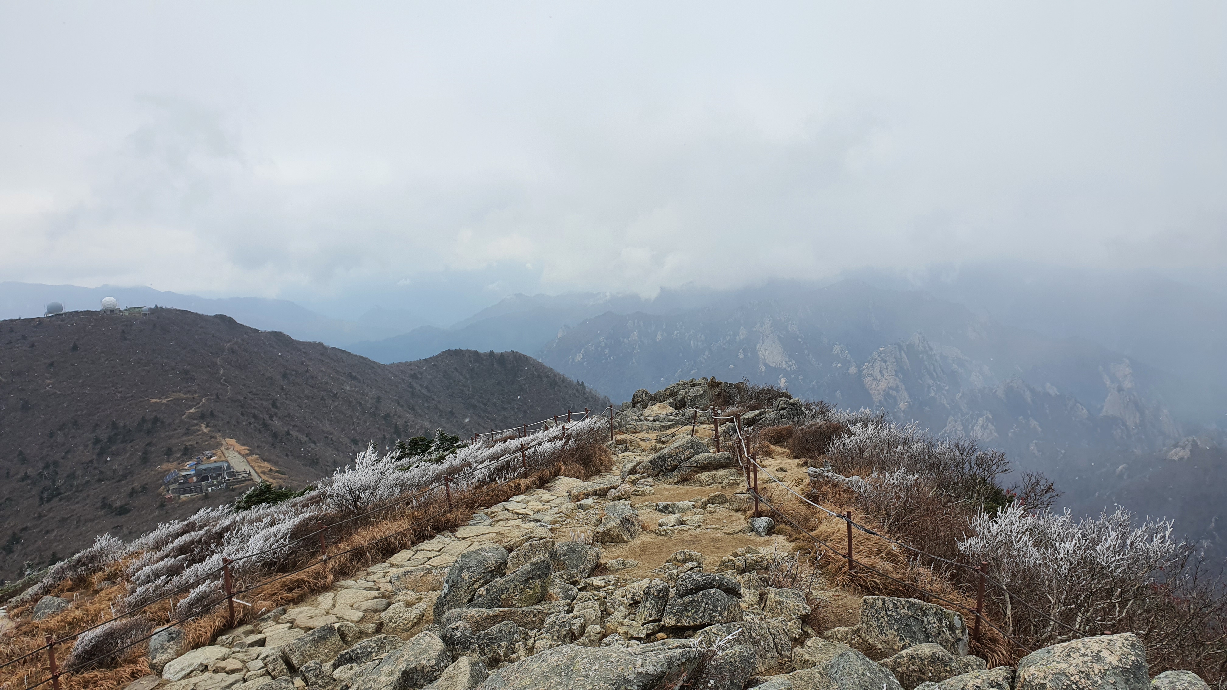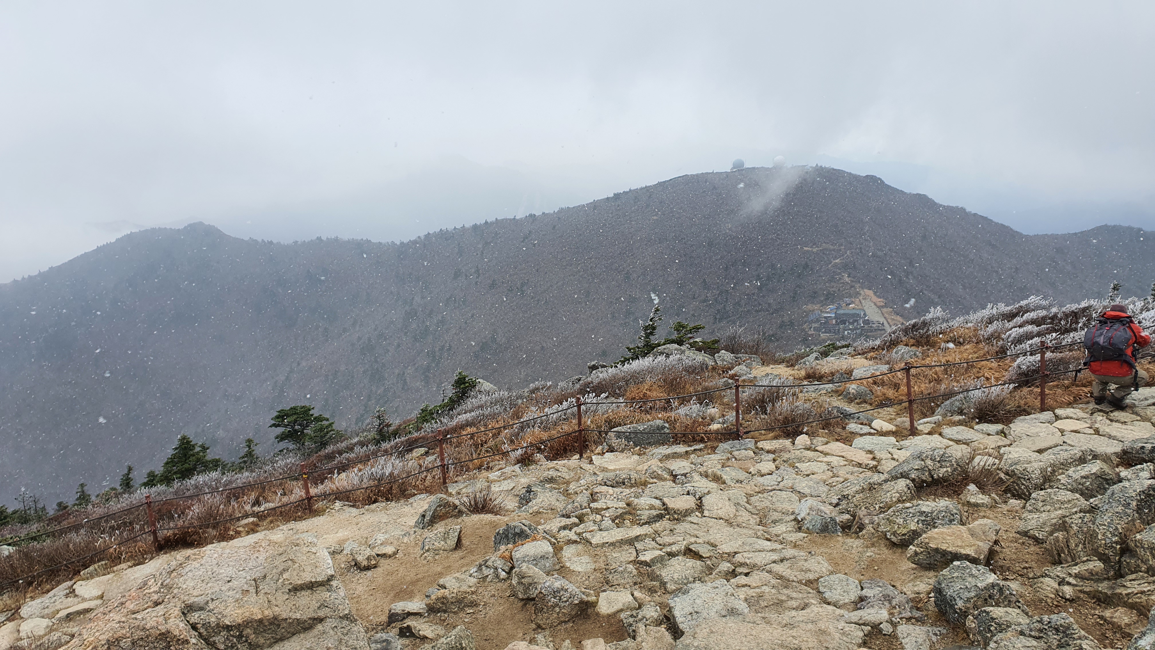 정상가까이 가자 첫눈이 바람에 날립니다. 올해 첫눈을 대청봉에서 맞이하니 감동이 밀려옵니다.
