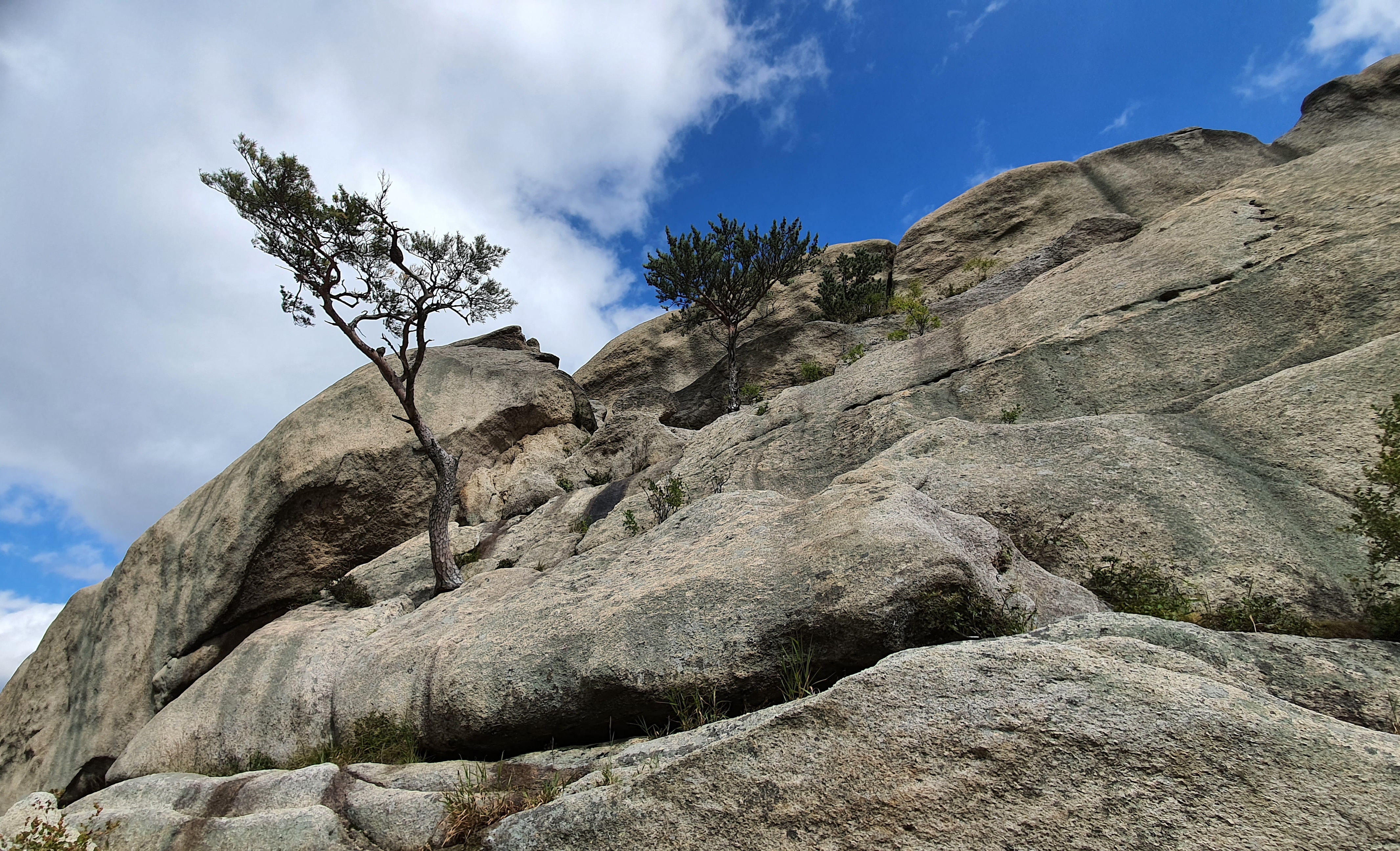 낙타바위 도착 - 단단하던 화강암 바위도 세월의 풍파속에 점차 모래알로 변화하고...낙타바위 표면에 사람들 발자국으로 생긴 홈이 깊게 패여있다. 지금도 손이나 발로 건드리면 모래가 부서져 내린다. 바위의 보존을 위해서라도 바위에 올라가지 말고 주변에 보호각을 세우는 조치가 필요할듯 하다.