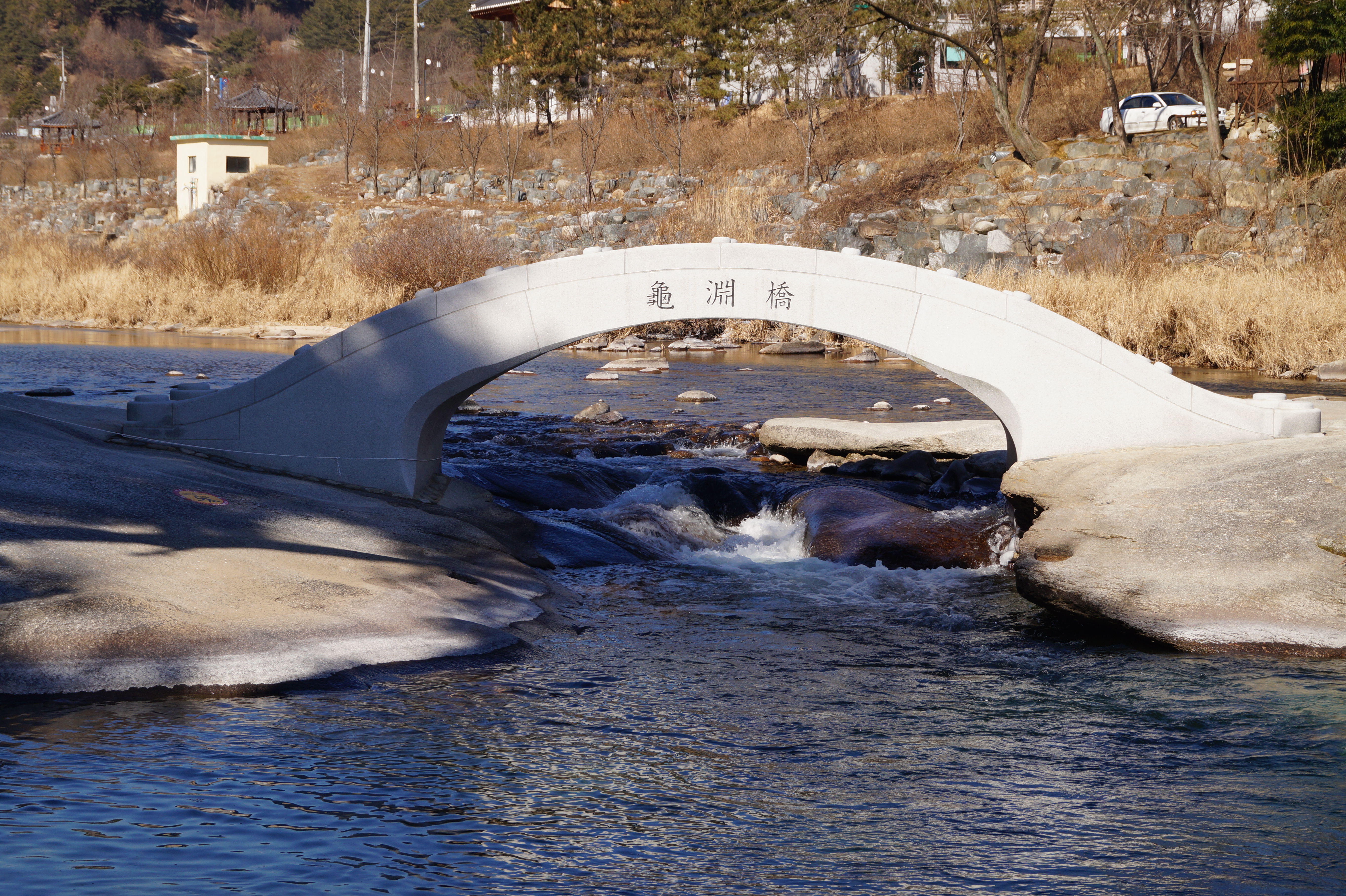 네 번째, 연반석硯磐石과 사담蛇潭, 세필짐洗筆㴨으로 거북바위 위쪽 구연교 아래 하얀 반석위에 바위틈을 따라 뱀처럼 길게 두 줄기 맑은 냇물이 흐르고 있는데 이곳을 사담이라 하고 반석 위 평평하며 넓은 웅덩이를 벼루를 가는 곳이라 하여 연반석이라 새겼다. 그 옆 길게 수로를 파내 세필짐이라 새기고 흐르는 물에 붓을 씻는 곳으로 사용하였다.