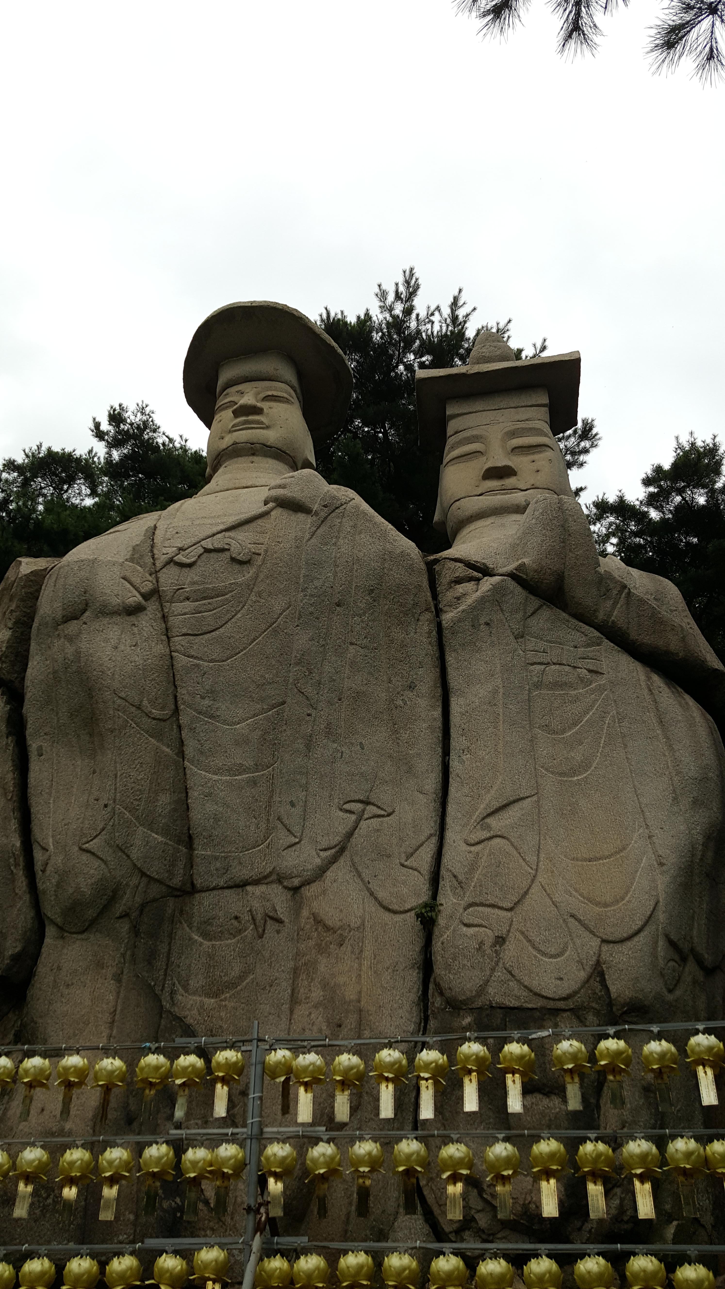 용미리 마애이불입상은 천연 암벽에 불상을 조각. 오른쪽 석불은 사각형 모자, 왼쪽 석불은 둥근 모자를 쓴 모습이므로 "용미리 쌍미륵석불", 우리에게는 부부미륵불로 더 알려져 있다. 거대한 바위를 다듬어 바위 면에 몸체를, 몸체 위에는 목과 머리, 갓을 조성해서 올렸다.