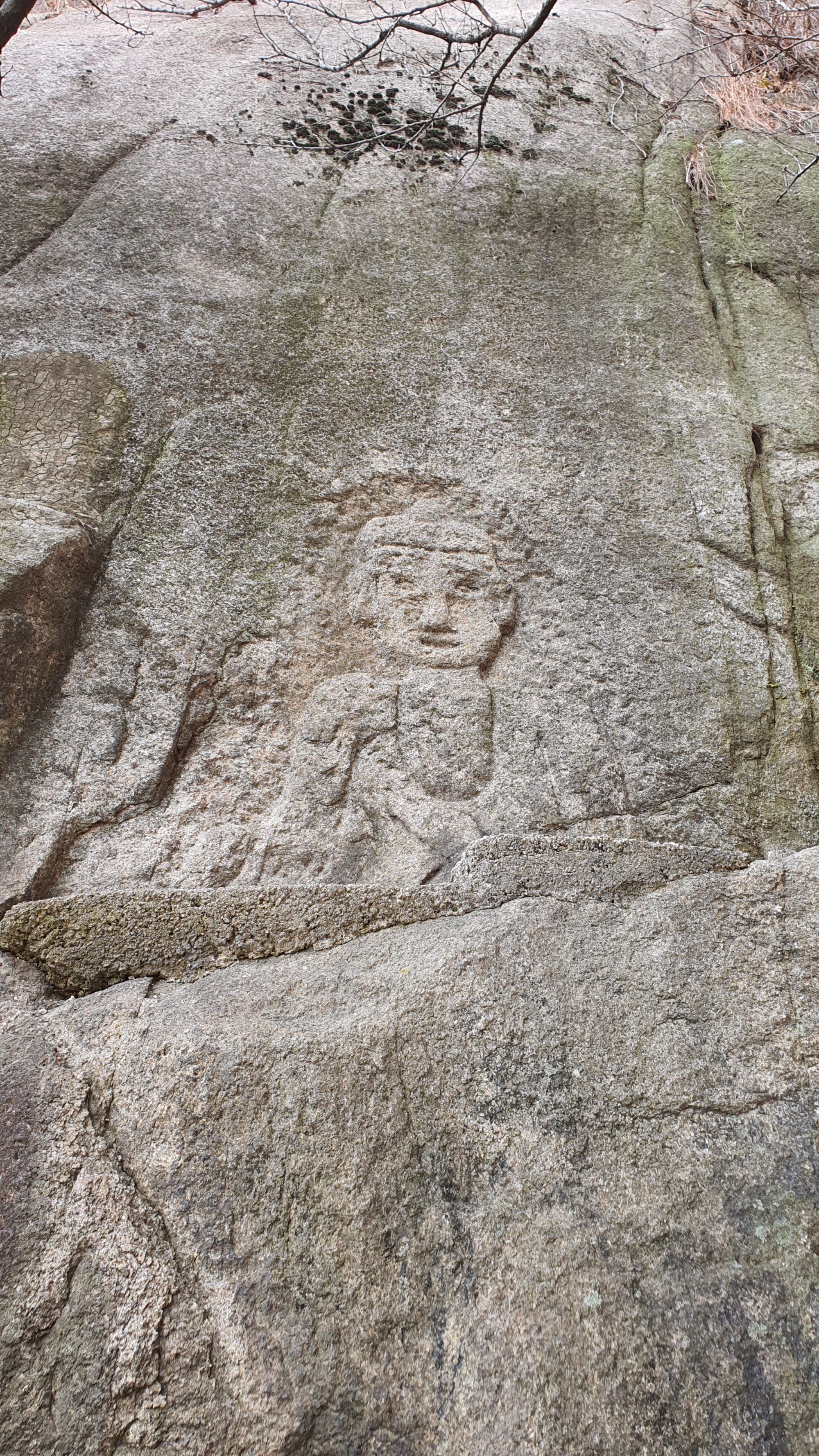 "국립중앙박물관 자료에 따르면 바위 오른쪽부터 첫째 열에 동아청년단결東亞靑年團結(동아청년단결), 둘째 열에는 皇紀 二千五百九十九年 九月 十六日(황기 이천오백구십구년 구월 십육일), 셋째 열에는 조선총독미나미지로朝鮮總督南次郞(조선 총독 미나미 지로)라는 큰 글씨의 순서로 쓰여 있다고 한다. 그리고 이보다 약간 왼쪽으로 사이를 띄어 ‘한 열에 28글자씩, 네 줄 길이’로 대일본청년단대회를 개최한다는 사실과 기념 각자(글자를 새김)를 남기는 연유를 서술한 내용이 새겨져 있었다는 것이다. 1939년 9월 16일, 17일 양일간에 걸쳐 대일본청년단대회가 경성(현 서울)에서 열렸는데 이것을 기념한 글씨를 학무국이 주도하여 인왕산의 얼굴인 치마바위에 새겼던 것이다."