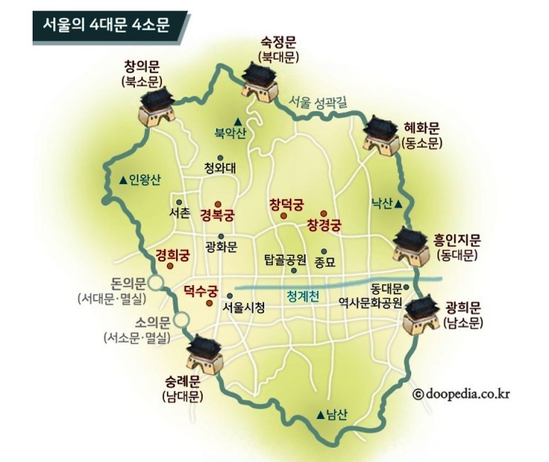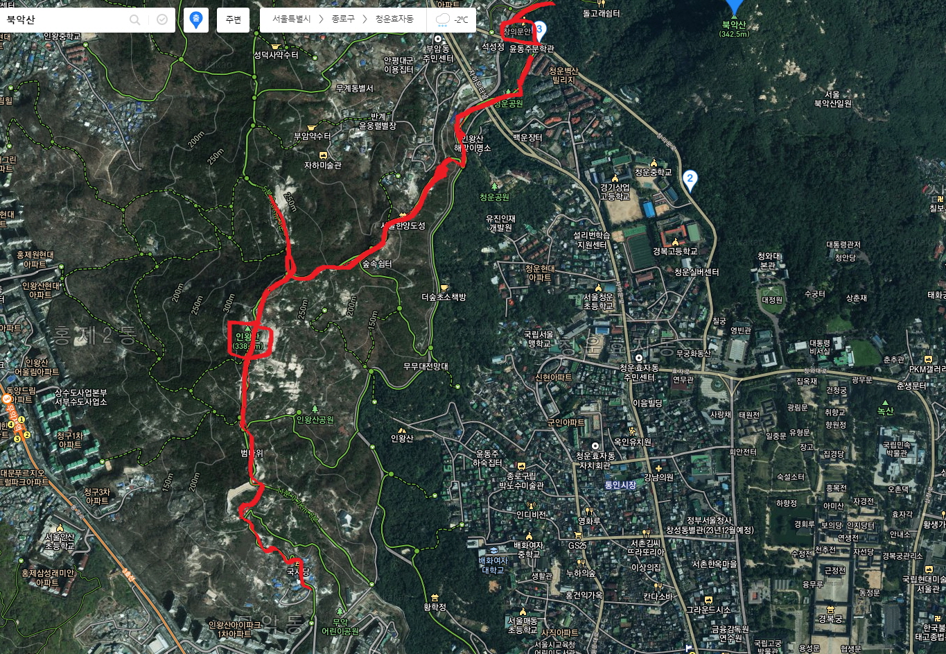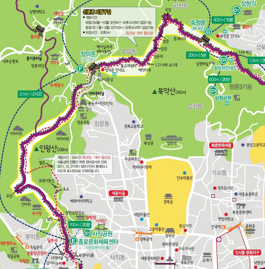 인왕산(선바위, 해골바위, 치마바위, 기차바위), 창의문(자하문) ,북악산北岳山, 청운대, 1.21소나무, 백악마루, 곡장(곡성), 숙정문, 백사실, 불암, 세검정, 홍지문(오간대수문), 옥천암(보도각 백불), ........대략 10 키로