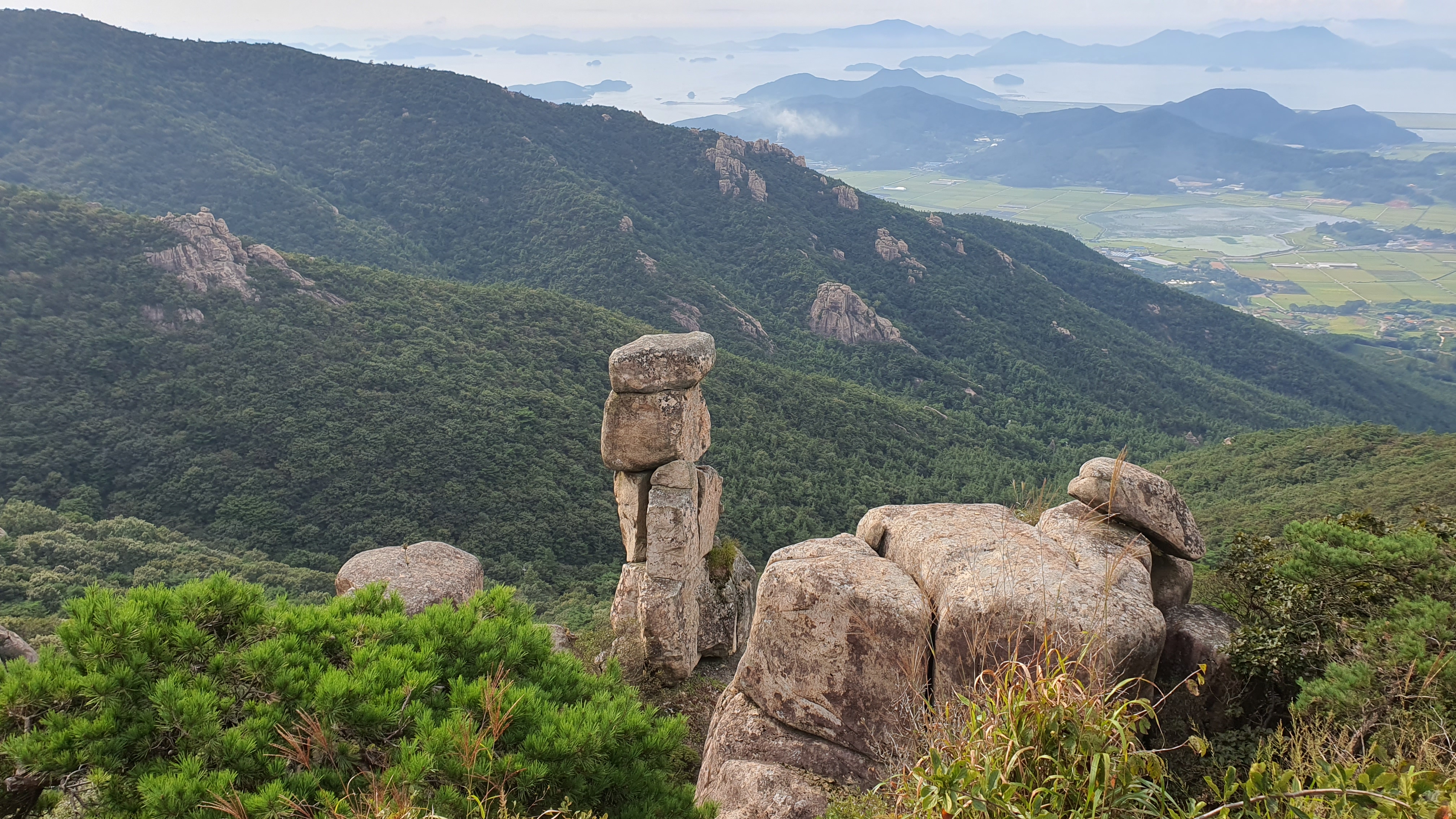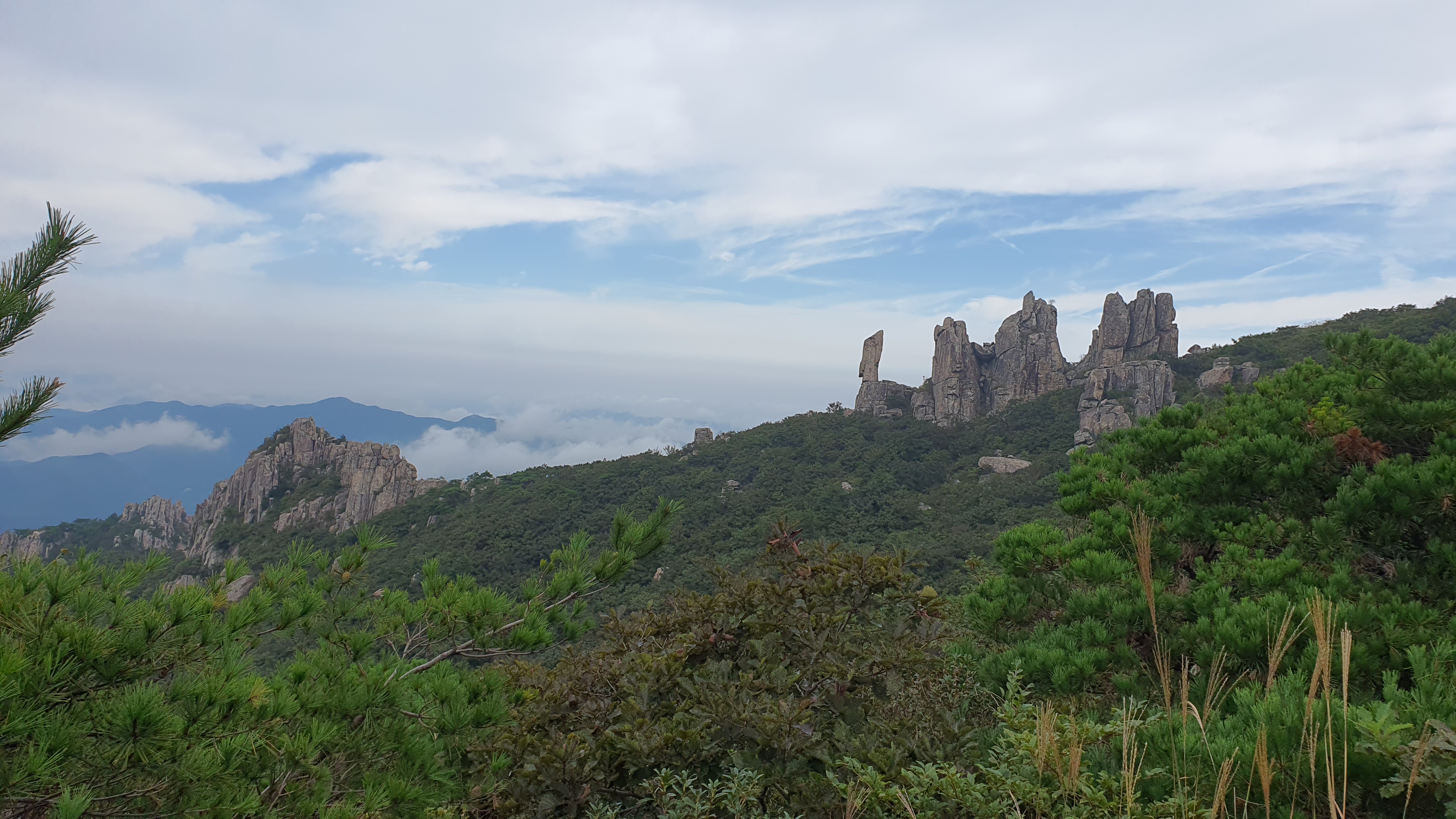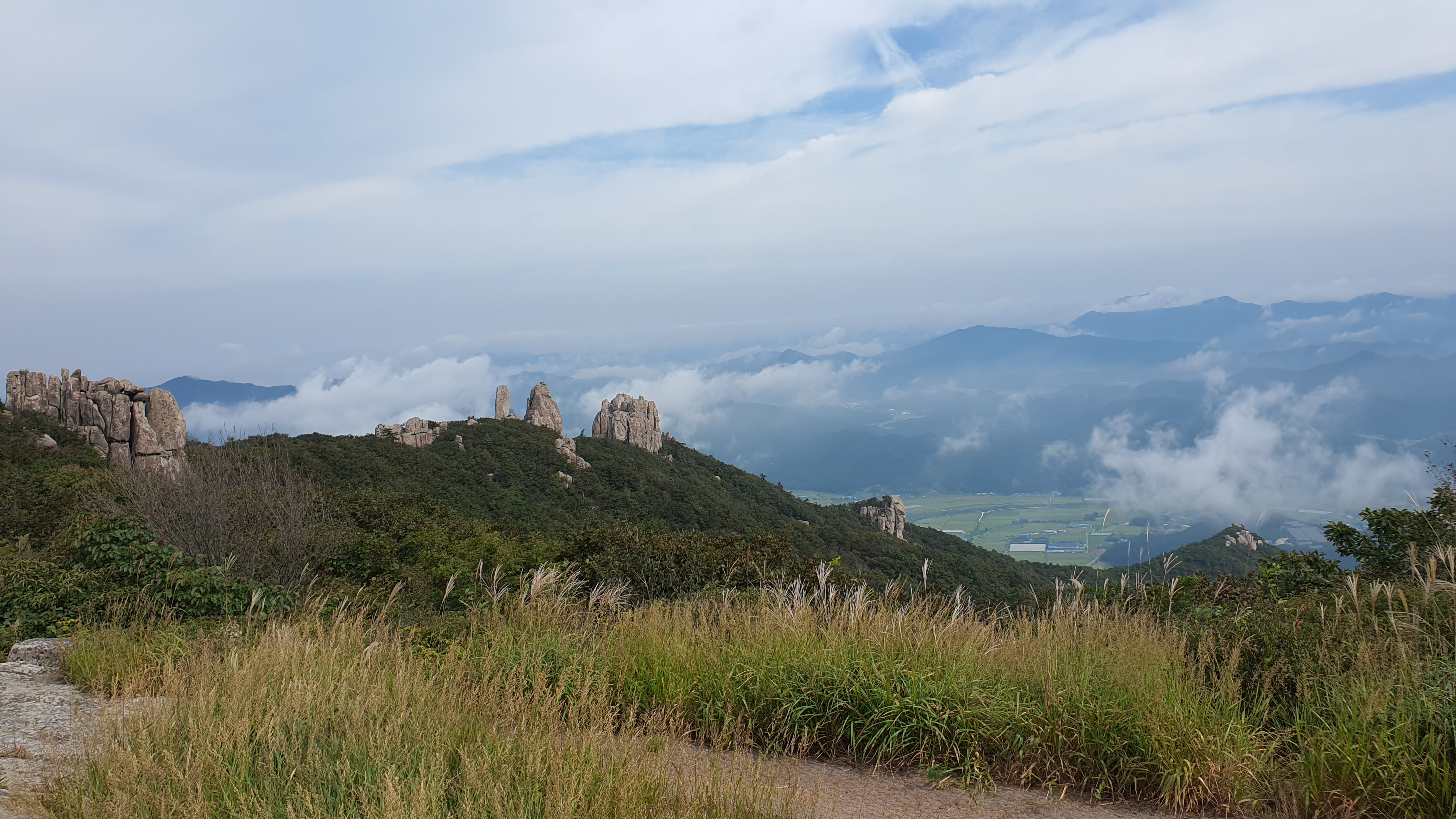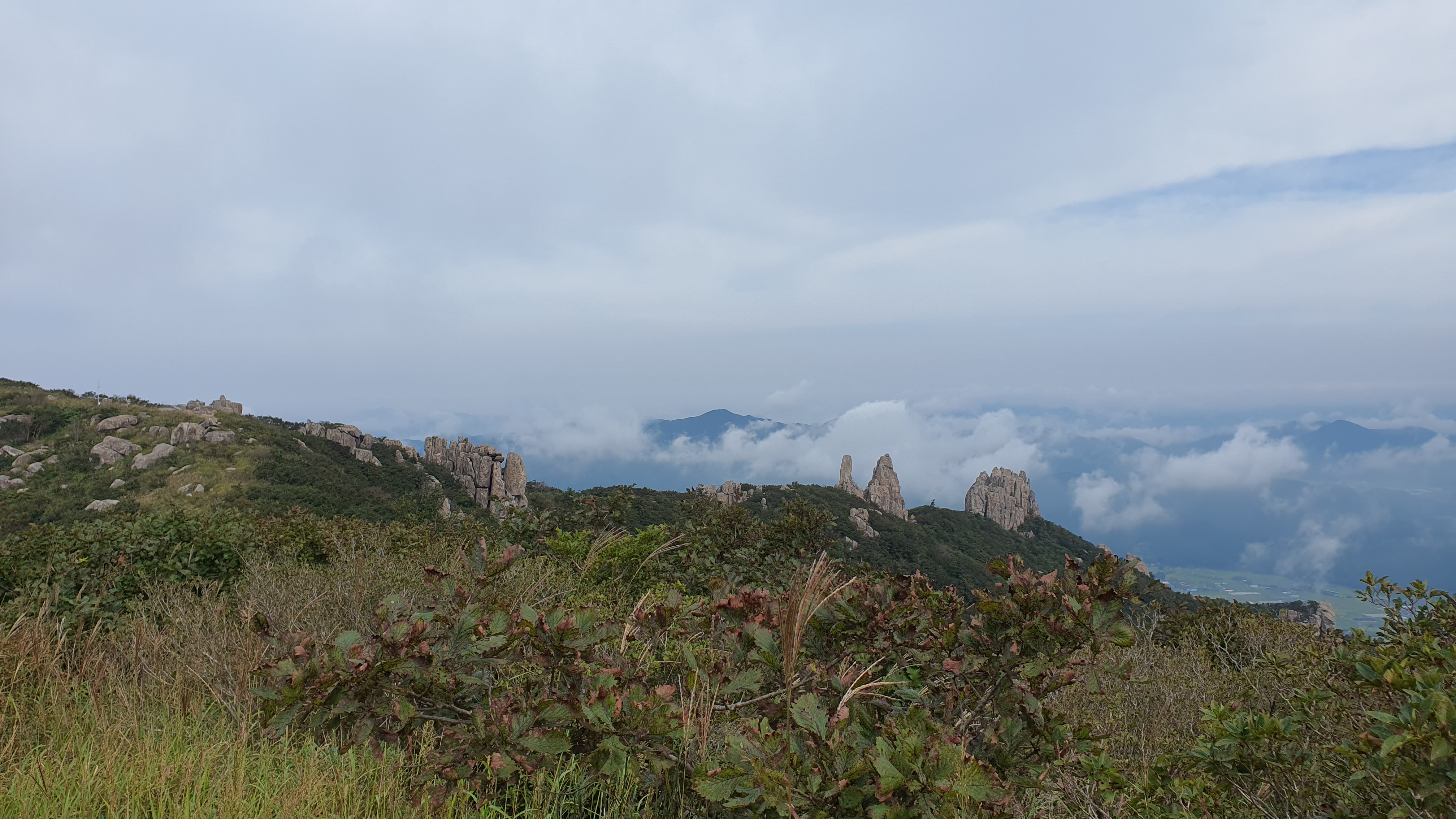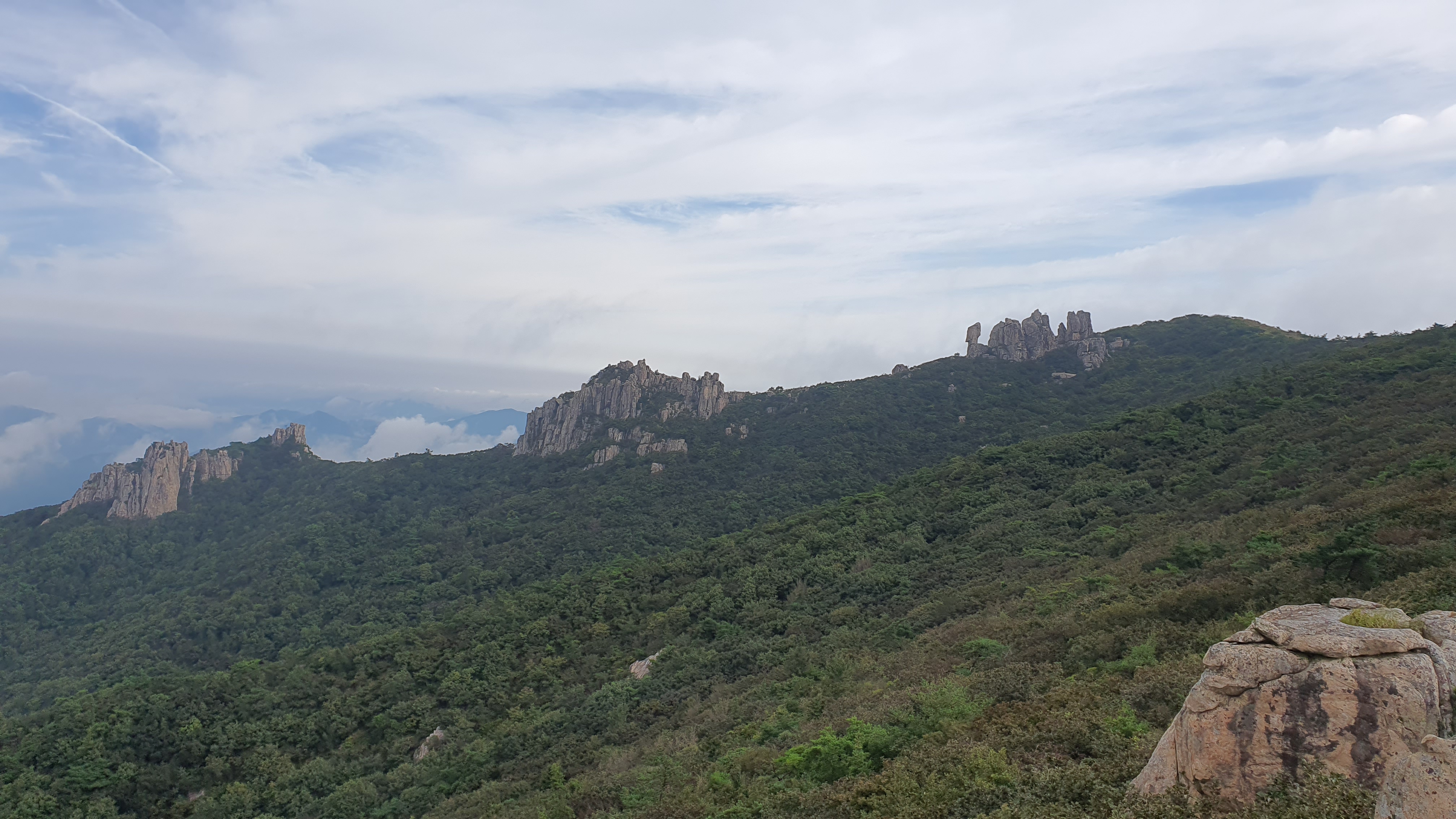 탑산사 주차장이리갈까 저리갈까 차라리 돌아갈까....세갈레 등로가 나오는데...가장 왼쪽 탑산사로 오르면 구룡봉을 바로 오를수 있습니다. 가운데 닭봉코스는 정상 연대봉으로 바로가고...오른쪽은 불영봉으로...석굴 수도처탑산사 도착.고양이 보리가 나와 맞이하고 스님은 법당에서 참선수행중이시네요.절을 통과하여 아육왕탑으로 올라갑니다.아육왕탑 직하 의상암지.아육왕탑. 아육왕은 아쇼카대왕으로 인도 전체를 통일하고 부처님의 가르침을 널리 전파한 부처님의 화신이라고 하는 인도의 대왕입니다.아쇼카대왕이 세운 불탑만 8만4천이라고 하니 과장을 좀 보태도 많은 불탑을 세웠습니다. 그중 우리나라에 부처님진신사리를 모셔와 자연 바위에 사리를 모신 불탑입니다.아육왕탑 위가 구룡봉입니다. 봉우리가 전체 통바위로 웅장하고 장흥 앞바다를 널리 조망할수 있는 최고의 조망처입니다.구룡봉에서 바라본 진죽봉과 지장봉왼쪽이 진죽봉 이티 바위라는데...물구덩이가 월출산 구정봉봉 보다 많습니다.구룡봉에서 날이 좋으면 한라산도 볼수 있습니다.진죽봉 이티바위진죽봉에 가서 보니 이렇게 생겼네요. 이짝서 보면 스핑크스. 저짝서 보면 이티.진죽봉에서 바라본 구룡봉환희대. 너럭바위세서 잠시 누웠다 갑니다.구정봉 라인. 맨앞이 천주봉, 다음이 당번봉, 문수봉, 보현봉, 대세봉, 선재봉, 관음봉...스님이 이름을 지은듯. 봉이라기보다는 바위라고 해야 맞을듯.당번천주봉과 대세봉억새가 가을을 재촉합니다.천관산 연대봉. 정상역할을 합니다.불영봉으로 가다보면 정남진 공원이 보입니다.구룡봉과 탑산사가 보입니다.달팽이바위?불영봉. 영락없는 부처님입니다. 자연이 만들어낸...